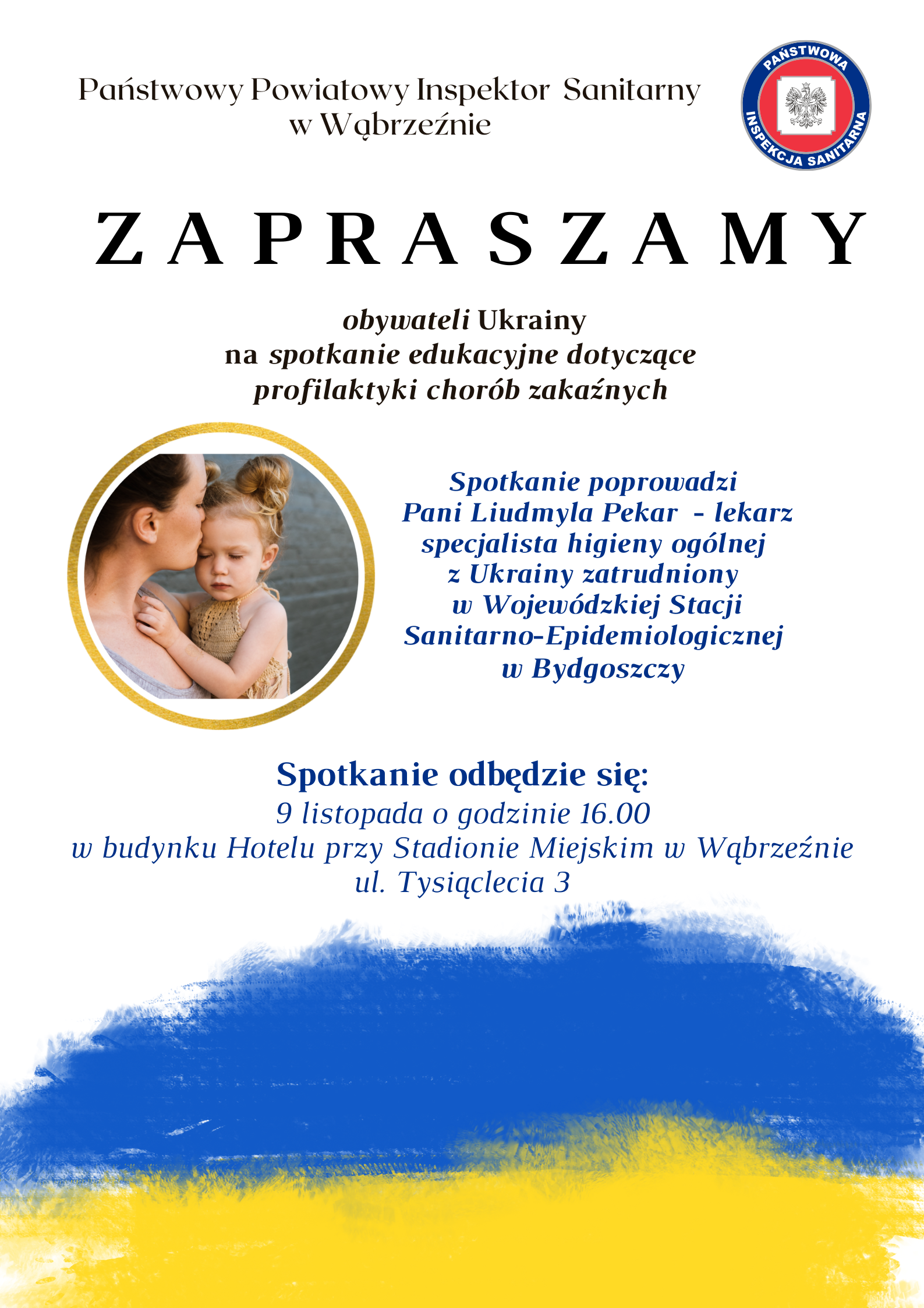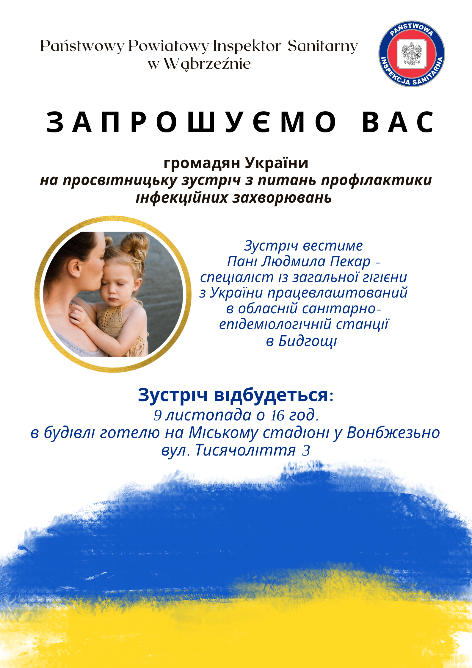 Запрошуємо вас громадян України на просвітницьку зустріч з питань профілактики інфекційних захворювань. Зустріч вестиме Пані Людмила Пекар - спеціаліст із загальної гігієниз України працевлаштований в обласній санітарно-епідеміологічній станції в Бидгощі.