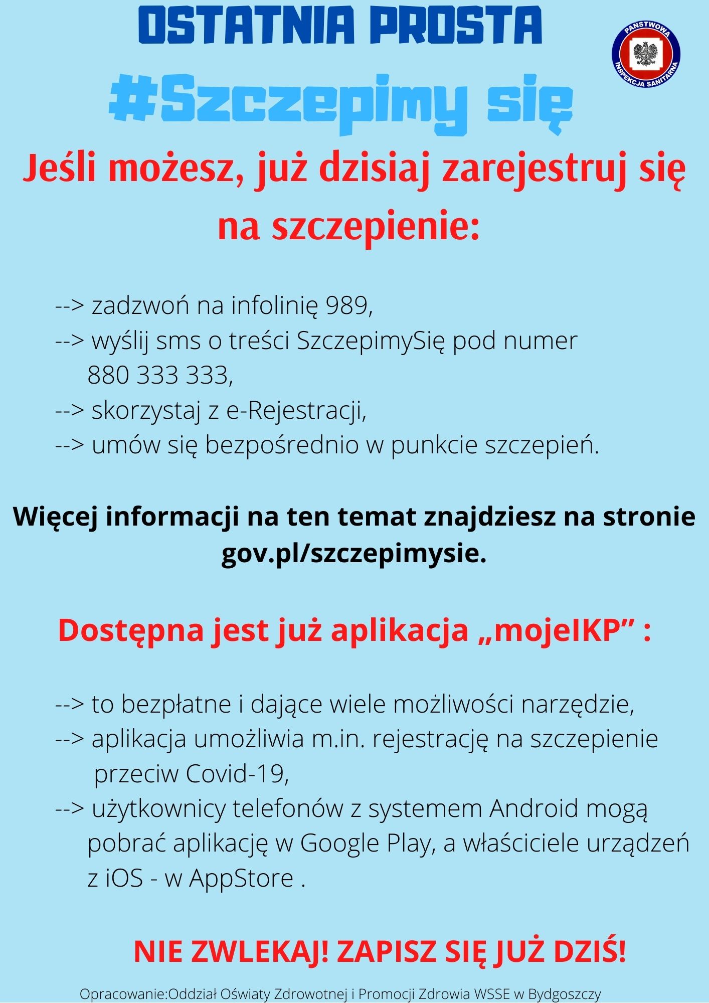 Jeśli możesz, już dzisiaj zarejestruj się na szczepienie: zadzwoń na infolinię 989, wyślij sms o treści SzczepimySię pod numer 880 333 333, skorzystaj z e-Rejestracji lub umów się bezpośrednio w punkcie szczepień. Więcej informacji na ten temat znajdziesz na stronie gov.pl/szczepimysie.