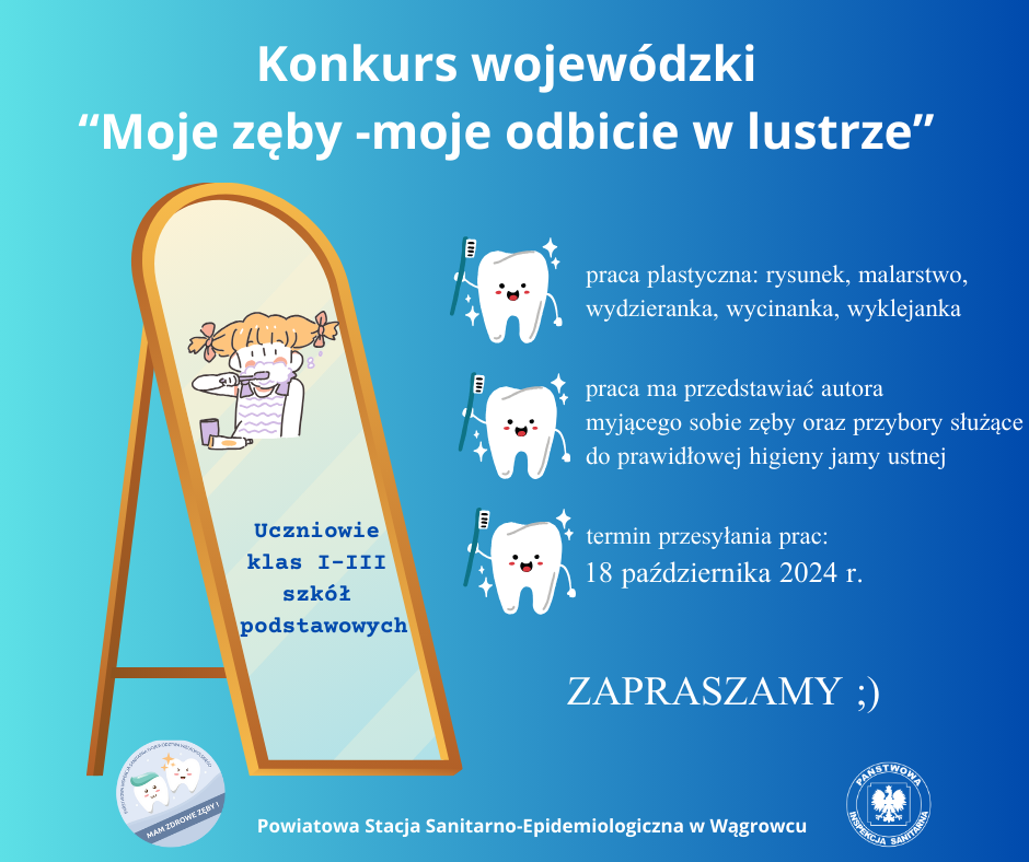 Zapraszamy uczniów klas I-III szkół podstawowych do udziału w konkursie „Myję zęby – moje odbicie w lustrze” zorganizowanym przez Wojewódzką Stację Sanitarno-Epidemiologiczną w Poznaniu. Partnerem konkursu jest Kuratorium Oświaty w Poznaniu.