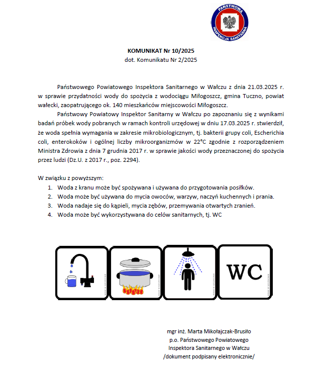 Komunikat nr 10/2025 dotyczący komunikatu nr 2/2025 w sprawie przydatności wody do spożycia z wodociągu Miłogoszcz, gmina Tuczno