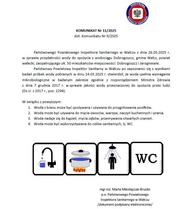 Komunikat nr 11/2025 dotyczący komunikatu nr 9/2025 w sprawie przydatności wody do spożycia z wodociągu Dobrogoszcz, gmina Wałcz