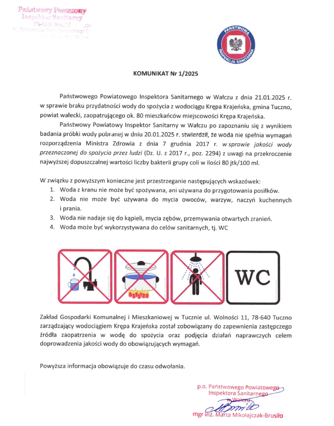 Komunikat nr 1/2025 w sprawie braku przydatności wody do spożycia z wodociągu Krępa Krajeńska, gmina Tuczno