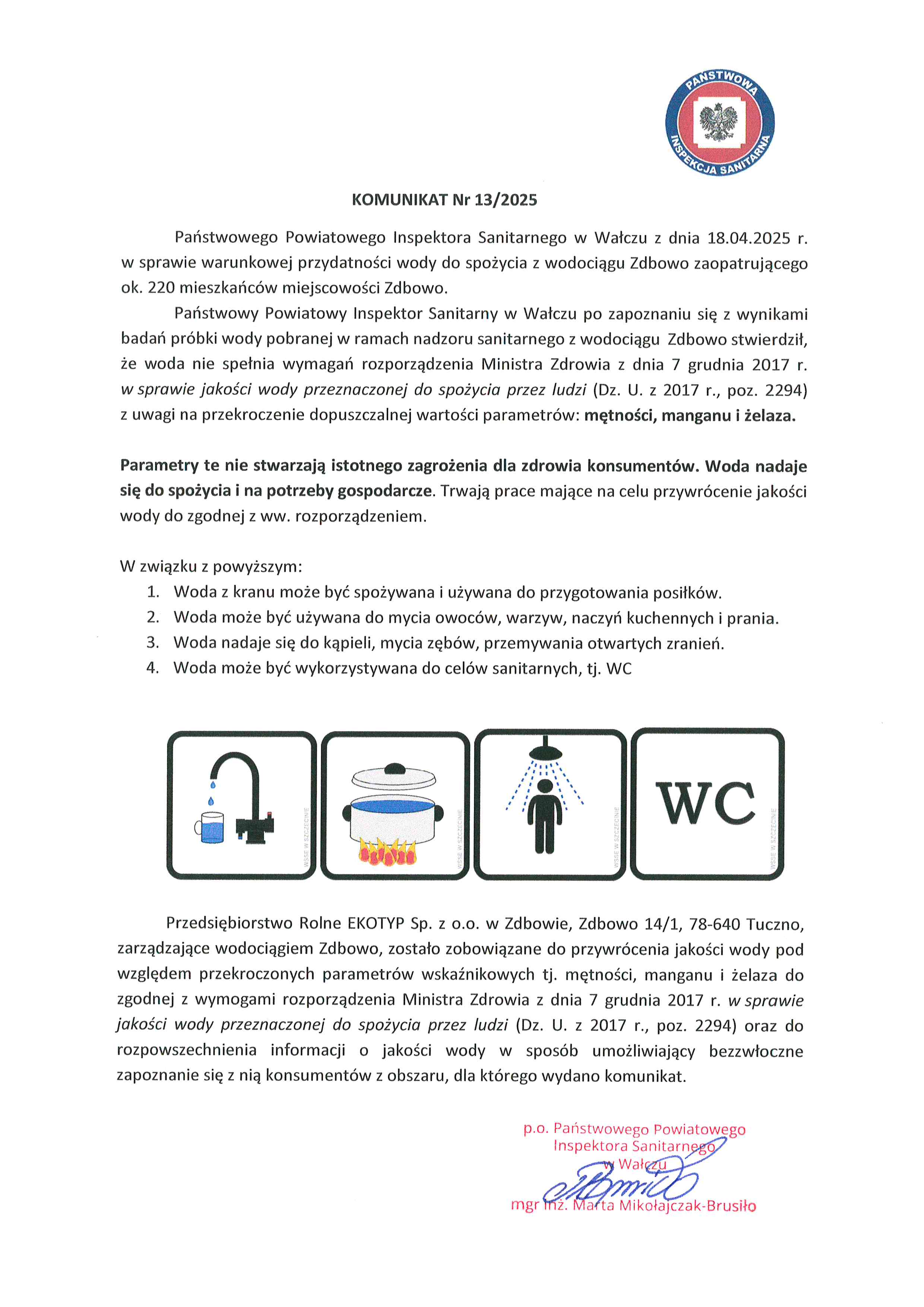 Komunikat nr 13/2025 w sprawie warunkowej przydatności wody do spożycia z wodociągu Zdbowo Materiały Komunikat_nr_13_Zdbowo Komunikat_nr_13_Zdbowo.pdf 0.38MB Zdjęcia (1) Pokaż zdjęcie 1 z galerii.