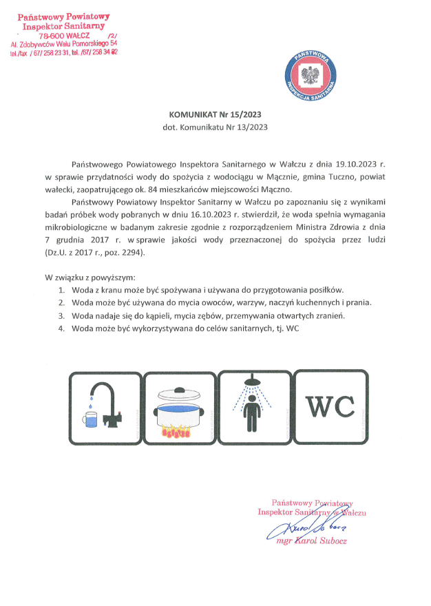 Komunikat nr 15/2023 dotyczący komunikatu nr 13/2023 w sprawie przydatności wody do spożycia z wodociągu w Mącznie, gmina Tuczno. 19.10.2023 Zdjęcia (1) Pokaż zdjęcie 1 z galerii.
