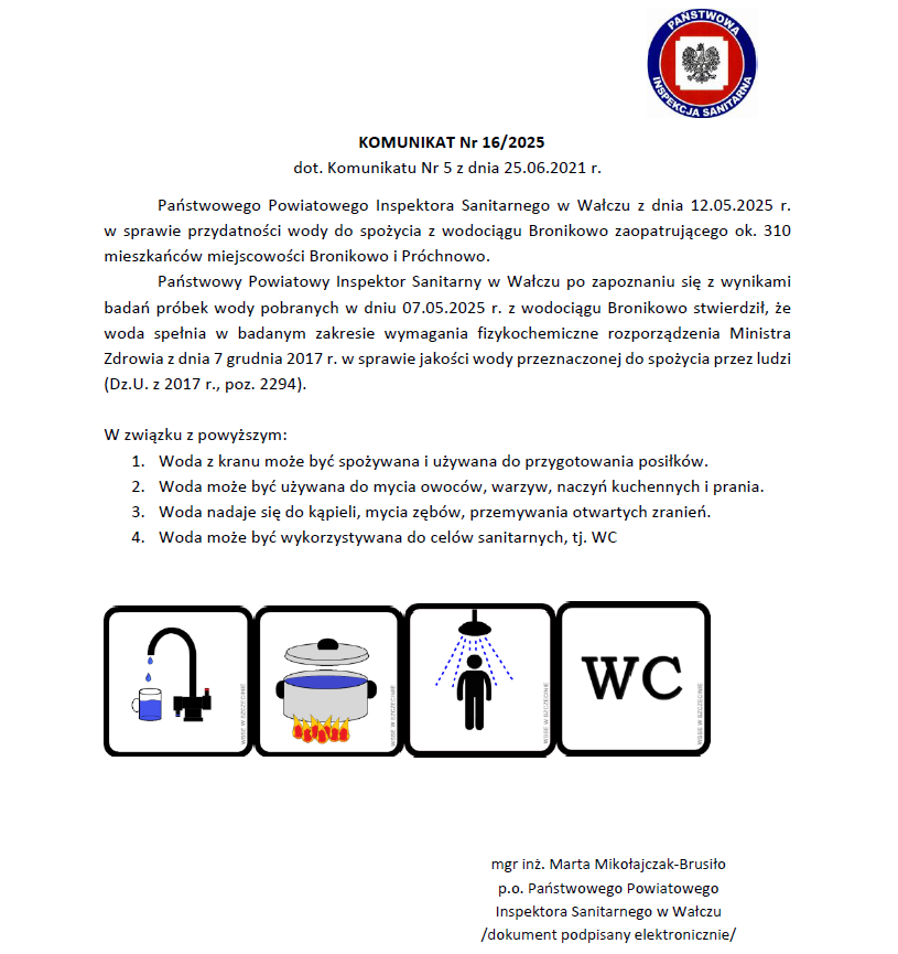 Komunikat nr 16/2025 dotyczący komunikatu nr 5 w sprawie przydatności wody do spożycia z wodociągu Bronikowo gmina Mirosławiec