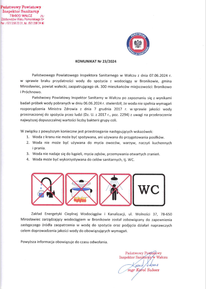 Komunikat nr 23/2024 w sprawie braku przydatności wody do spożycia z wodociągu w Bronikowie (Bronikowo i Próchnowo), gmina Mirosławiec 07.06.2024 Zdjęcia (1) Pokaż zdjęcie 1 z galerii.