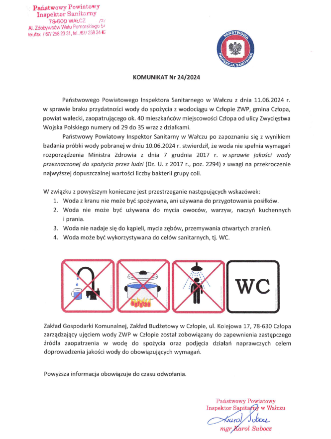 Komunikat nr 24/2024 w sprawie braku przydatności wody do spożycia z wodociągu w Człopie ZWP, gmina Człopa