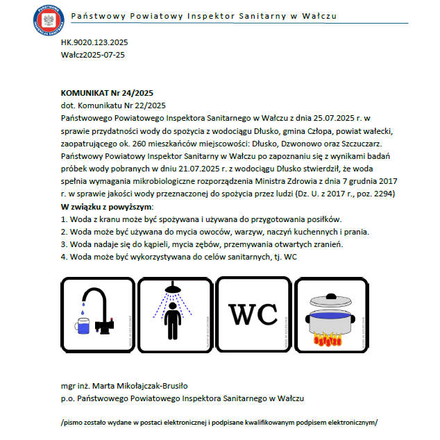 Komunikat nr 24/2025 dotyczący komunikatu nr 22/2025 w sprawie przydatności wody do spożycia z wodociągu Dłusko, gmina Człopa