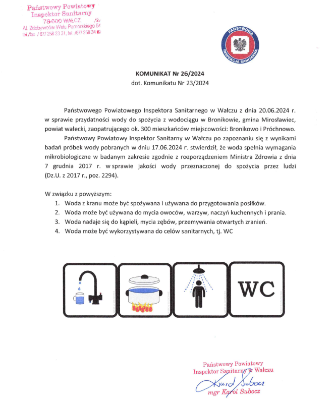 Komunikat nr 26/2024 dotyczący komunikatu nr 23/2024 w sprawie przydatności wody do spożycia z wodociągu w Bronikowie, gmina Mirosławiec