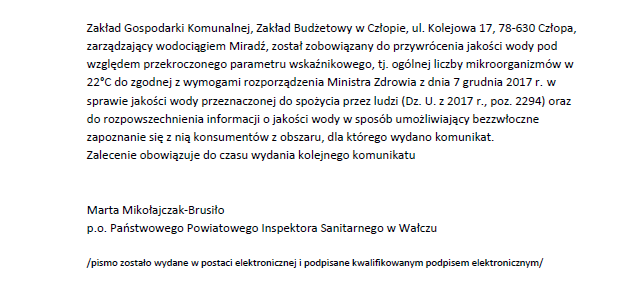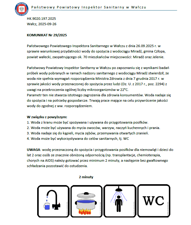 Komunikat nr 29/2025 w sprawie warunkowej przydatności wody do spożycia z wodociągu Miradź, gmina Człopa