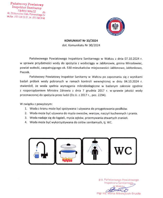 Komunikat nr 33/2024 dotyczący Komunikatu nr 30/2024 w sprawie przydatności wody do spożycia z wodociągu w Jabłonowie, gmina Mirosławiec