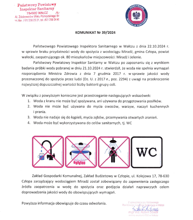 Komunikat nr 39/2024 w sprawie braku przydatności wody do spożycia z wodociągu Miradź, gmina Człopa