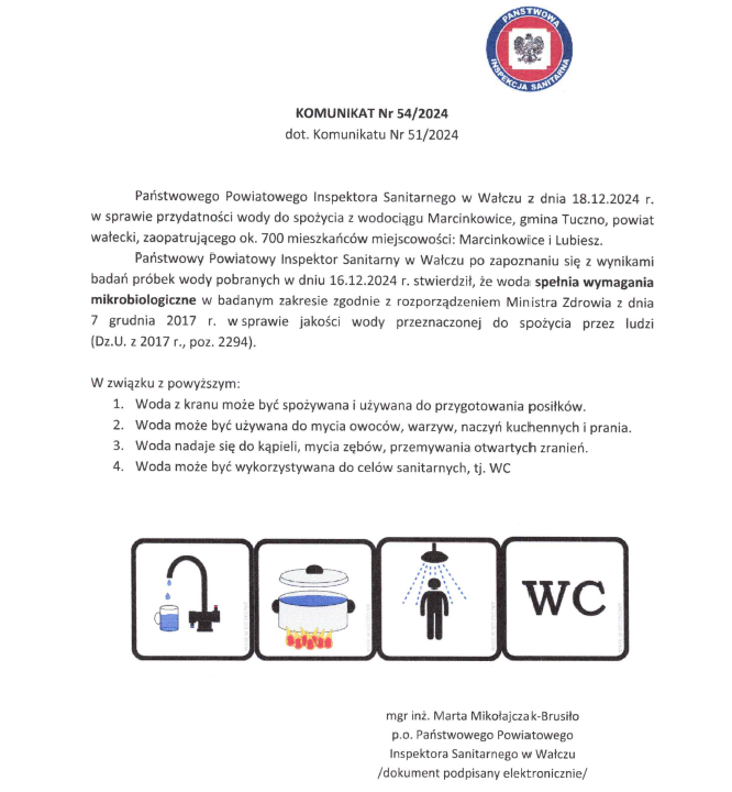 Komunikat nr 54/2024 dotyczący komunikatu nr 51/2024 w sprawie przydatnosci wody do spożycia z wodociągu Marcinkowice, gmina Tuczno
