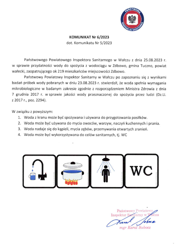 Komunikat nr 6/2023 do komunikatu nr 5/2023 w sprawie przydatności wody do spożycia z wodociągu w Zdbowie 25.08.2023 Zdjęcia (1) Pokaż zdjęcie 1 z galerii.