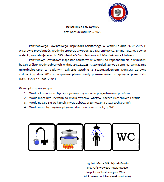 Komunikat nr 6/2025 dot. komunikatu nr 5/2025 w sprawie przydatności wody do spożycia z wodociągu Marcinkowice, gmina Tuczno