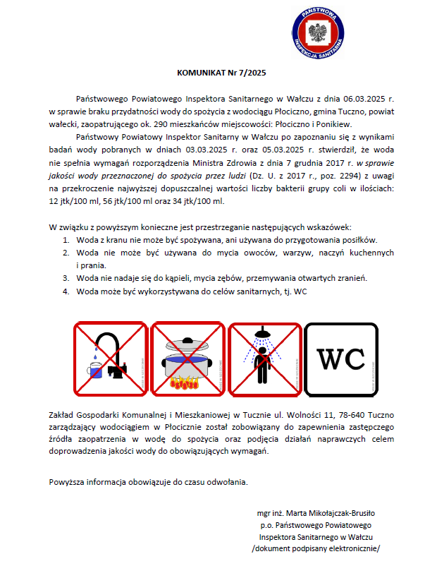 Komunikat nr 7/2025 w sprawie braku przydatności wody do spożycia z wodociągu Płociczno, gmina Tuczno