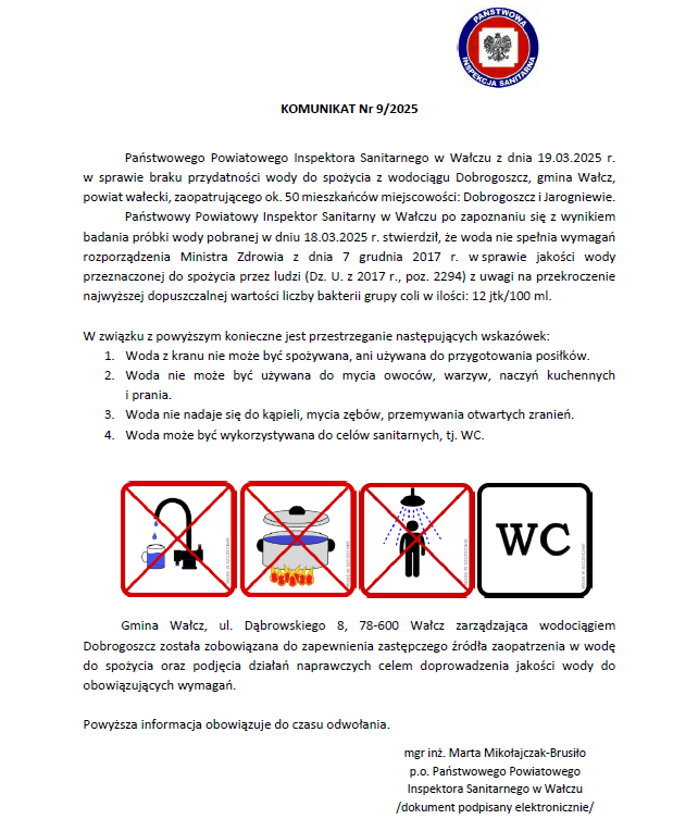 Komunikat nr 9/2025 w sprawie braku przydatności wody do spożycia z wodociągu Dobrogoszcz, gmina Wałcz