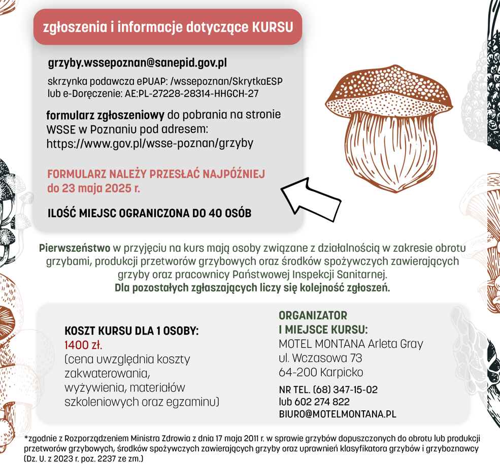 Informujemy, że w dniach od 11- 13.06.2025 r. organizowany jest kurs dla kandydatów na klasyfikatora grzybów