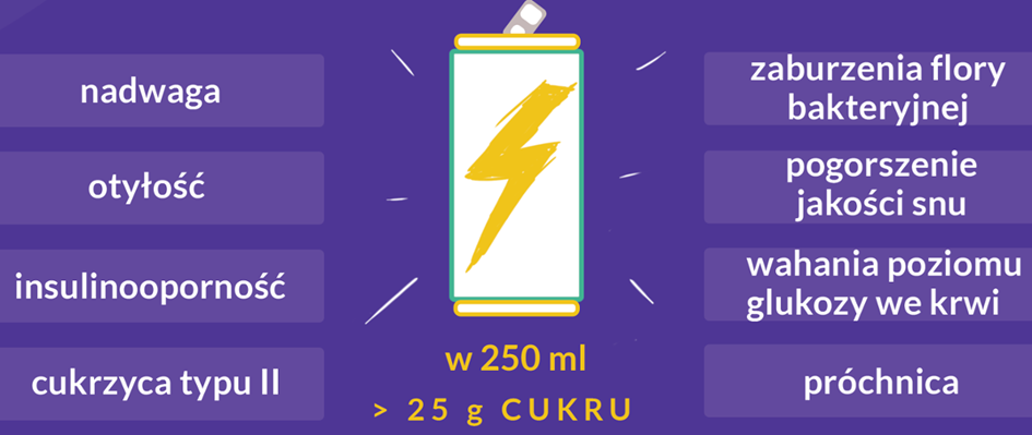 Istotnym niebezpieczeństwem dla zdrowia dzieci i młodzieży związanym ze spożywaniem napojów energetycznych jest bardzo wysoka zawartość cukrów. W kontekście doniesień na temat rosnącego odsetka osób z nadwagą i otyłością wśród polskiej młodzieży należy zwrócić na napoje energetyczne i ich potencjalny wpływ na pogarszanie się tego stanu.