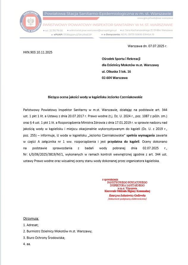 Państwowy Powiatowy Inspektor Sanitarny w m.st. Warszawie, działając na podstawie art. 344 ust. 1 pkt 1 lit. a Ustawy z dnia 20.07.2017 r. Prawo wodne (t.j. Dz. U. 2024 r., poz. 1087 z późn. zm.) oraz § 4 ust. 1 pkt 1 lit. a Rozporządzenia Ministra Zdrowia z dnia 17.01.2019 r. w sprawie nadzoru nad jakością wody w kąpielisku i miejscu okazjonalnie wykorzystywanym do kąpieli (Dz. U. z 2019 r., poz. 255) – informuje, iż informuje
