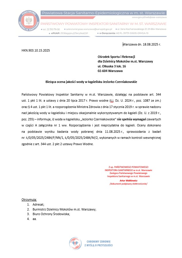 Państwowy Powiatowy Inspektor Sanitarny w m.st. Warszawie, działając na podstawie art. 344 ust. 1 pkt 1 lit. a ustawy z dnia 20 lipca 2017 r. Prawo wodne (t.j. Dz. U. 2024 r., poz. 1087 ze zm.) oraz § 4 ust. 1 pkt 1 lit. a rozporządzenia Ministra Zdrowia z dnia 17 stycznia 2019 r. w sprawie nadzoru nad jakością wody w kąpielisku i miejscu okazjonalnie wykorzystywanym do kąpieli (Dz. U. z 2019 r., poz. 255) – informuje, iż woda w kąpielisku „Jeziorko Czerniakowskie” nie spełnia wymagań zawartych