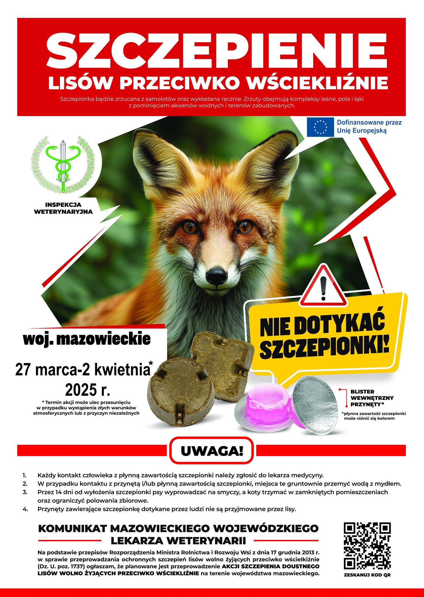 W dniach 27 marca-2 kwietnia 2025 r. Mazowiecki Wojewódzki Lekarz Weterynarii przeprowadza akcję szczepienia lisów wolno żyjących przeciwko wściekliźnie na terenie województwa mazowieckiego.
