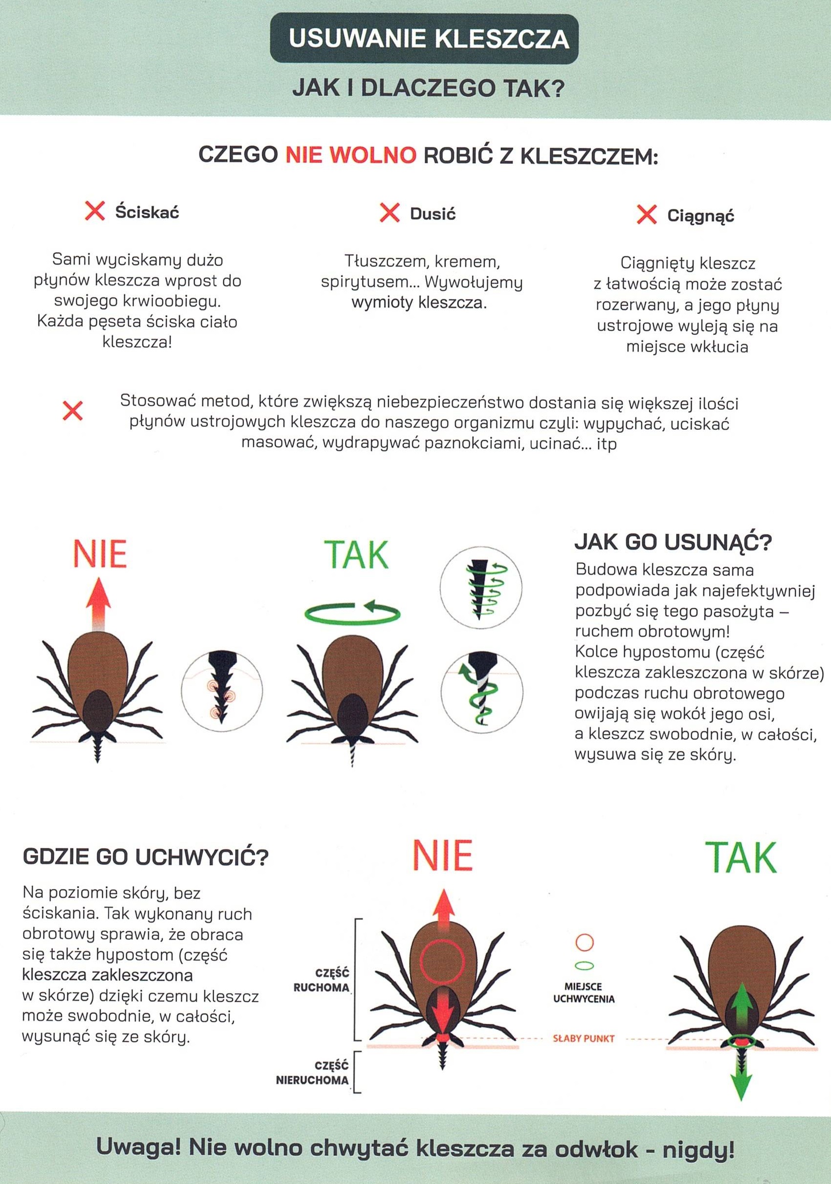 - jeśli kleszcz wkłuł się w Twoją skórę, usuń go jak najszybciej w całości, bez uciskania go.