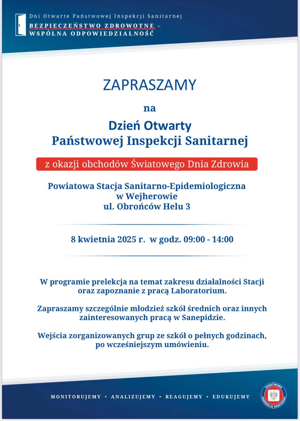 W dniu 8 kwietnia 2025r. (wtorek) zapraszamy do Powiatowej Stacji Sanitarno-Epidemiologicznej w Wejherowie na Dzień Otwarty. Dowiesz się czym się zajmujemy i jak dbamy o zdrowie publiczne. Poznasz tajniki pracy w naszym laboratorium. Zapraszamy wszystkich chętnych, a szczególnie zainteresowanych pracą w Inspekcji Sanitarnej.