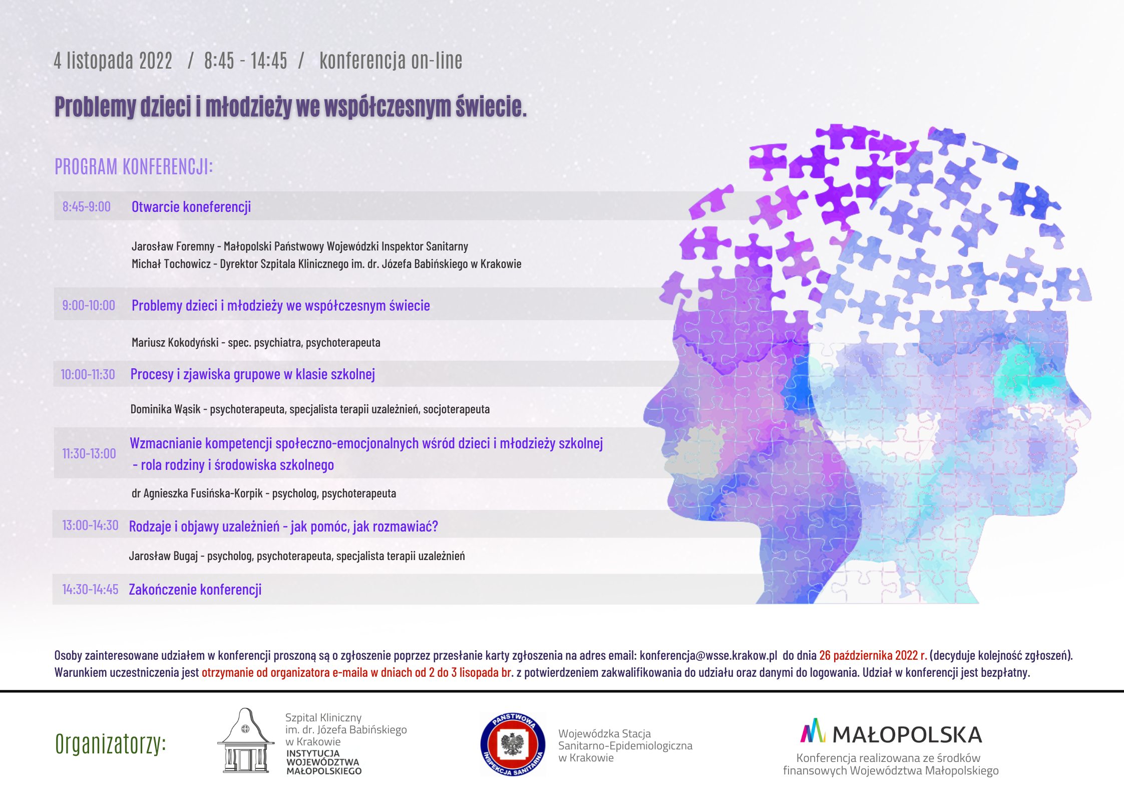 Wojewódzka Stacja Sanitarno-Epidemiologiczna w Krakowie oraz Wojewódzki OśrodekTerapii Uzależnień i Współuzależnień Szpitala Klinicznego im. dr. Józefa Babińskiego SP ZOZ w Krakowie serdecznie zapraszają dyrektorów, pracowników placówek szkolno-wychowawczych, nauczycieli, pedagogów małopolskich szkół podstawowych i ponadpodstawowych na konferencję on-line pod tytułem: Problemy dzieci i młodzieży we współczesnym świecie
