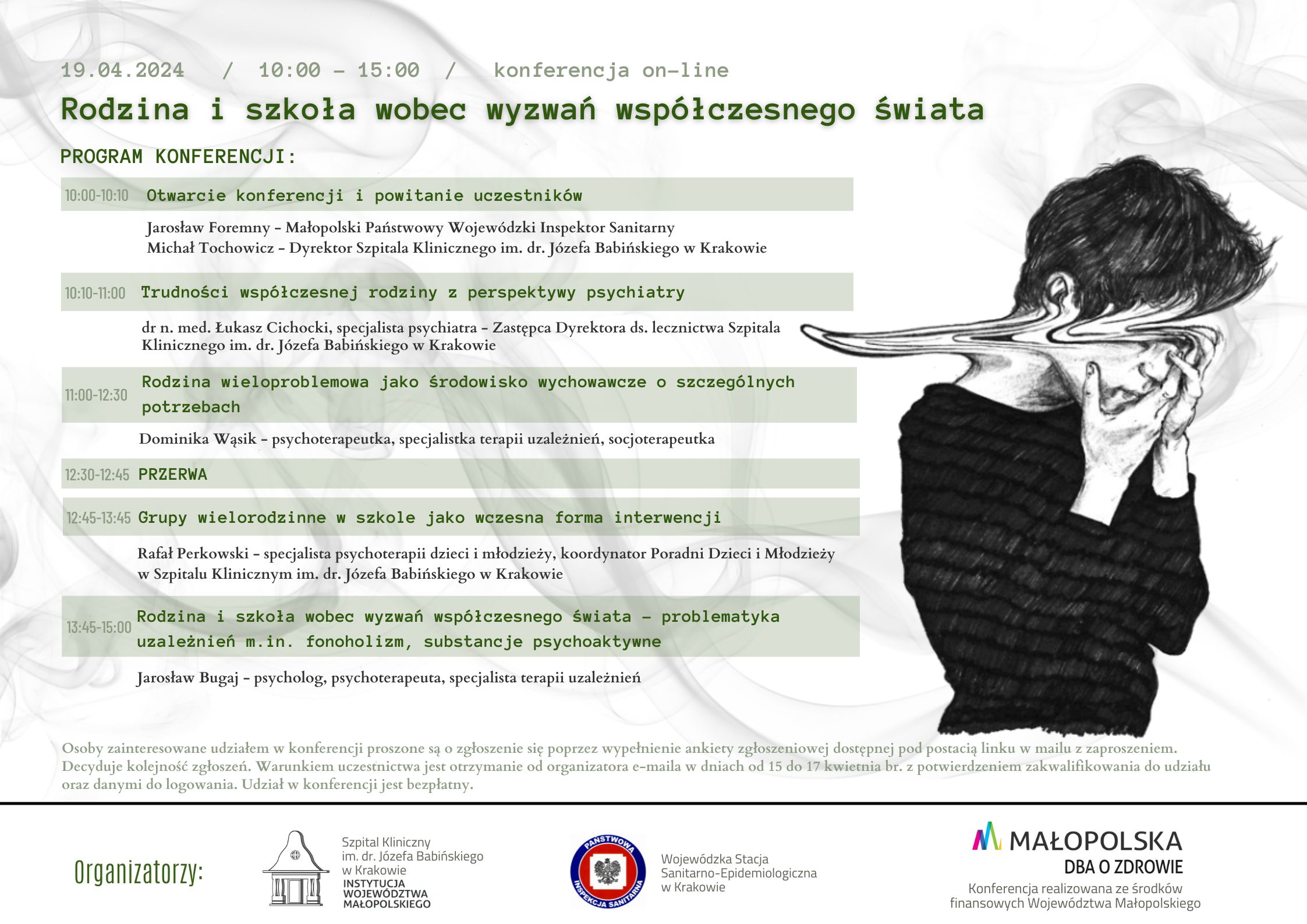 Wojewódzka Stacja Sanitarno-Epidemiologiczna w Krakowie przy współpracy z Wojewódzkim Ośrodkiem Terapii Uzależnienia i Współuzależnienia im. dr. Józefa Babińskiego SP ZOZ w Krakowie zapraszają na konferencję on-line „Rodzina i szkoła wobec wyzwań współczesnego świata”.
