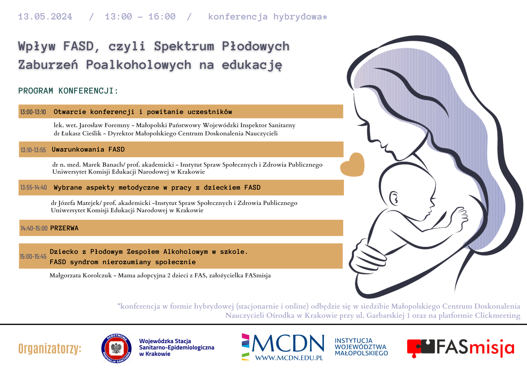 Wojewódzka Stacja Sanitarno-Epidemiologiczna w Krakowie przy współpracy z Małopolskim Centrum Doskonalenia Nauczycieli organizuje konferencję pn. ,,Wpływ FASD, czyli Spektrum Zaburzeń Poalkoholowych na edukację" w dn. 13.05 br. w godz. 13:00-16:00. Konferencja w formie hybrydowej (stacjonarnie i online) odbędzie się w siedzibie Małopolskiego Centrum Doskonalenia Nauczycieli Ośrodka w Krakowie przy ul. Garbarskiej 1 oraz na platformie Clickmeeting.
