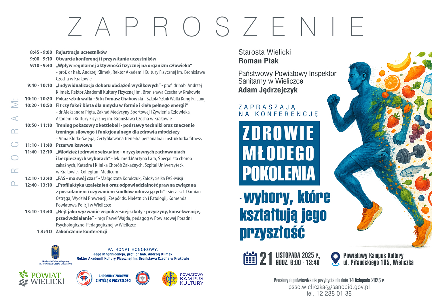 Państwowy Powiatowy Inspektor Sanitarny w Wieliczce, oraz Starosta Powiatu Wielickiego serdecznie zapraszają do wzięcia udziału w bezpłatnej konferencji pt „Zdrowie młodego pokolenia – wybory, które kształtują jego przyszłość”, która odbędzie się 21.11.2025 r . w godzinach 9:00–13:40 w auli Powiatowego Kampusu Kultury, ul. Marszałka Józefa Piłsudskiego 105, 32-020 Wieliczka.