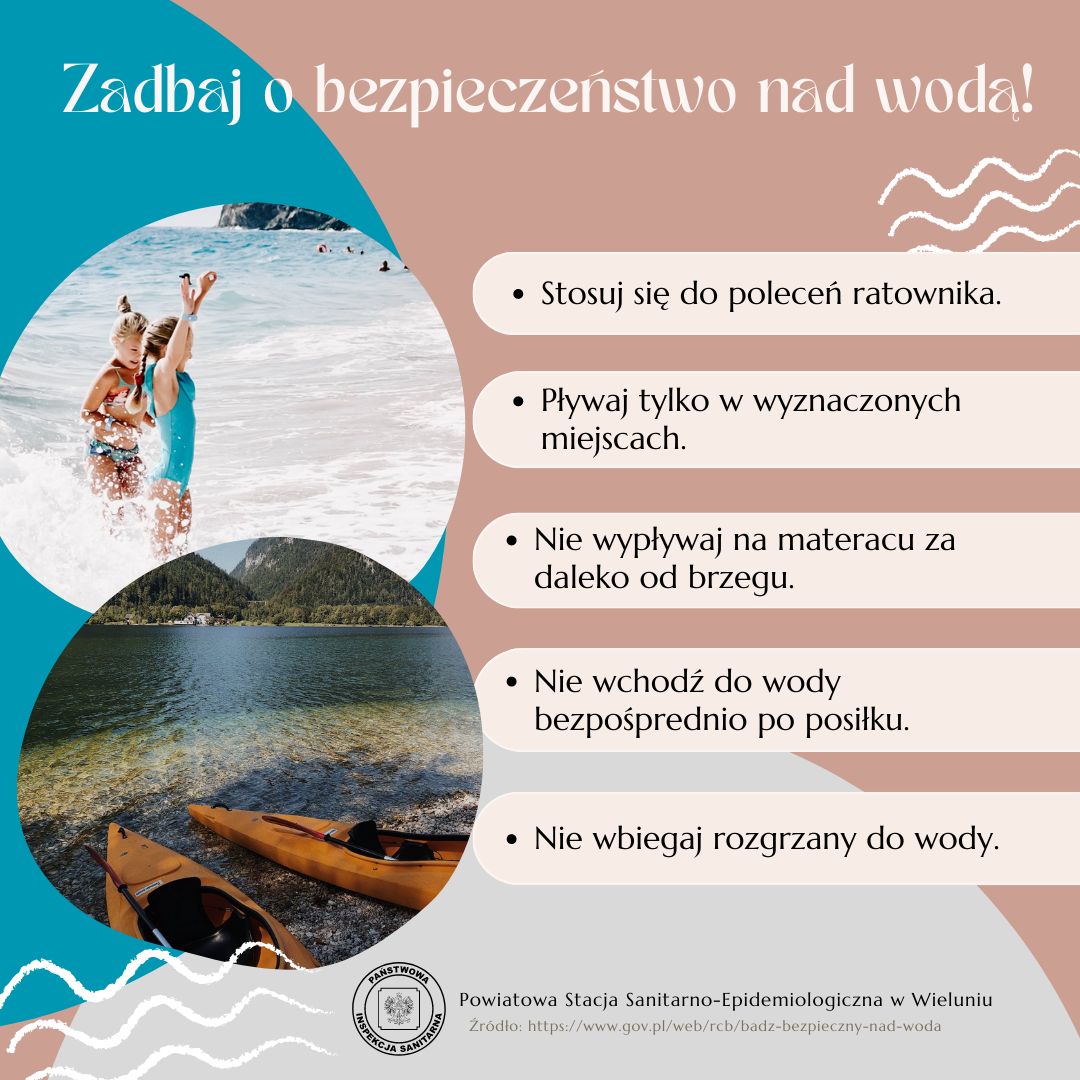 Podczas wypoczynku nad wodą, bądź pewien, że wybierasz kąpieliska strzeżone lub miejsca wykorzystywane do kąpieli. Bacznie obserwuj osoby kąpiące się, które są pod Twoją opieką. Gdy coś Cię zaniepokoi powiadom ratownika!