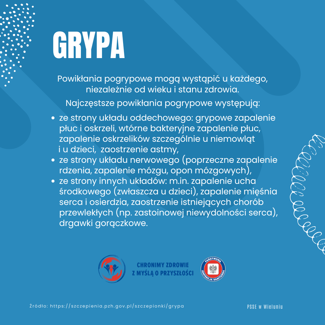 Najczęściej powikłania pogrypowe dotyczą układu oddechowego i obejmują grypowe zapalenie płuc i oskrzeli, wtórne bakteryjne zapalenie płuc oraz zapalenie oskrzelików, szczególnie u niemowląt i dzieci. Mogą również wystąpić zakażenia bakteryjne, takie jak zakażenia pneumokokowe czy meningokokowe, a także zaostrzenie astmy.