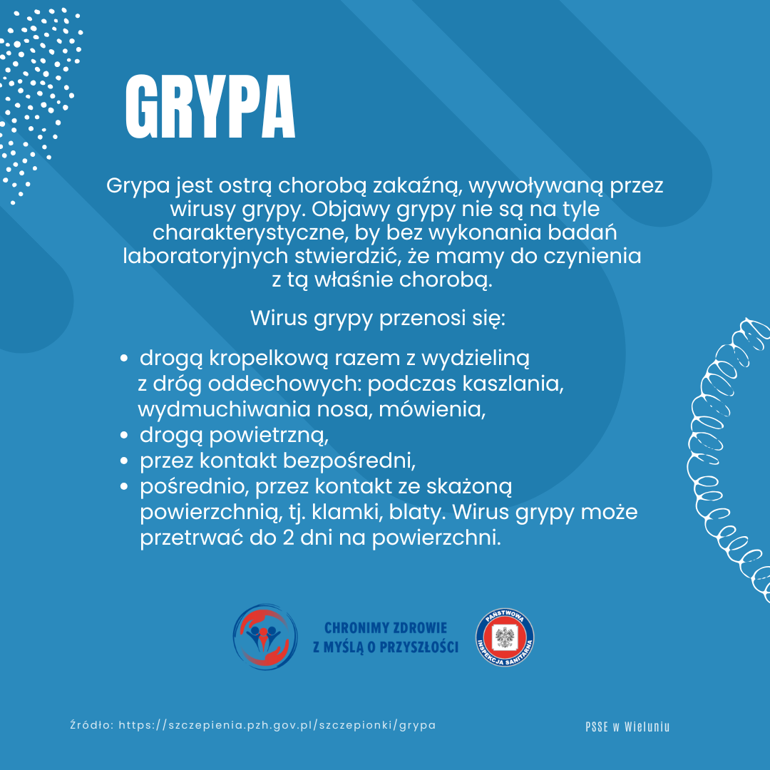 Do zakażenia grypą najczęściej dochodzi drogą kropelkową, czyli przez kontakt z wydzielinami osoby chorej podczas kaszlu, kichania lub mówienia, a także przez bezpośredni kontakt z zakażonymi powierzchniami. W Polsce sezon epidemiczny grypy trwa zwykle od października do maja, ze szczytem zachorowań pomiędzy styczniem a marcem. Osoba zakażona może transmitować wirusa grypy zanim jeszcze pojawią się objawy choroby: