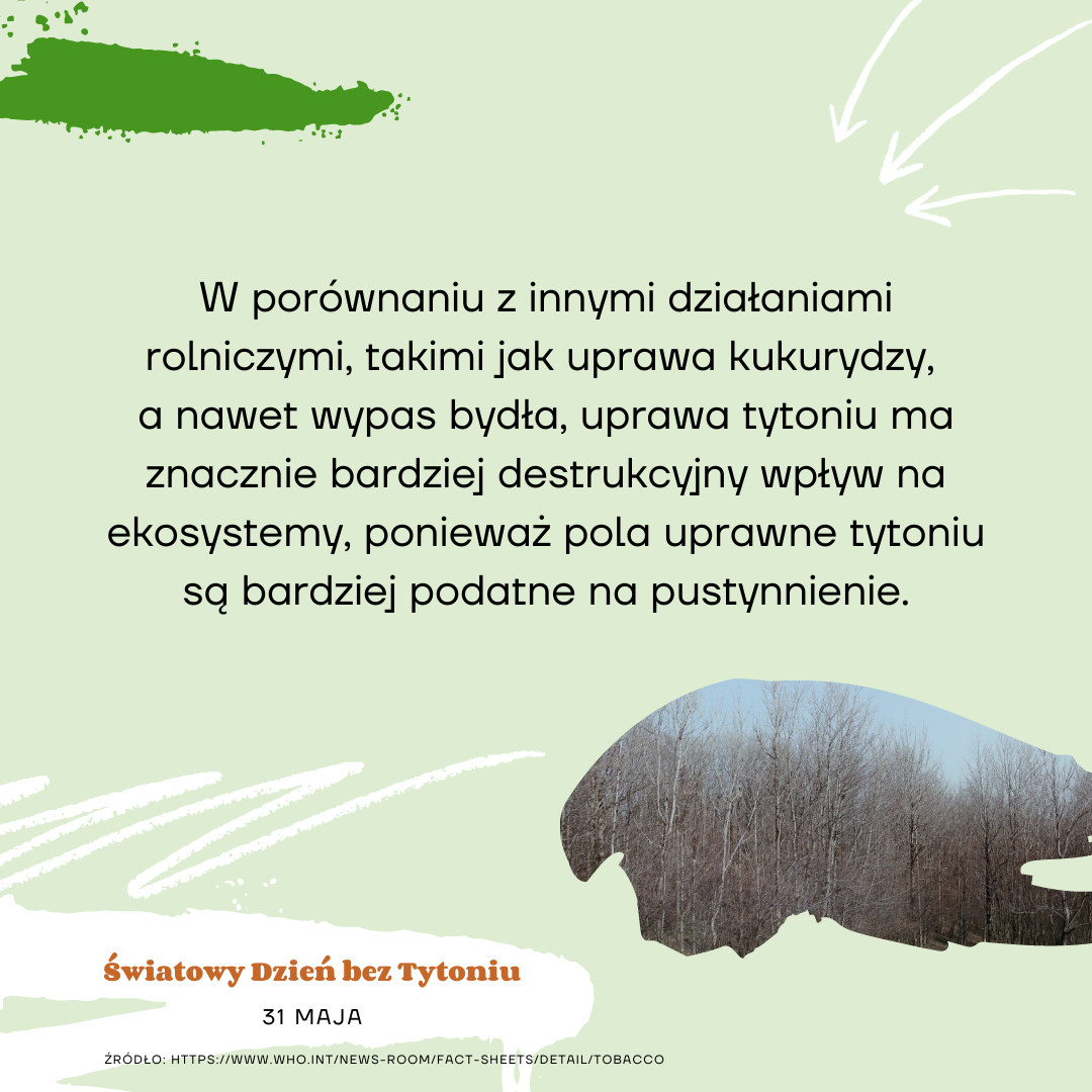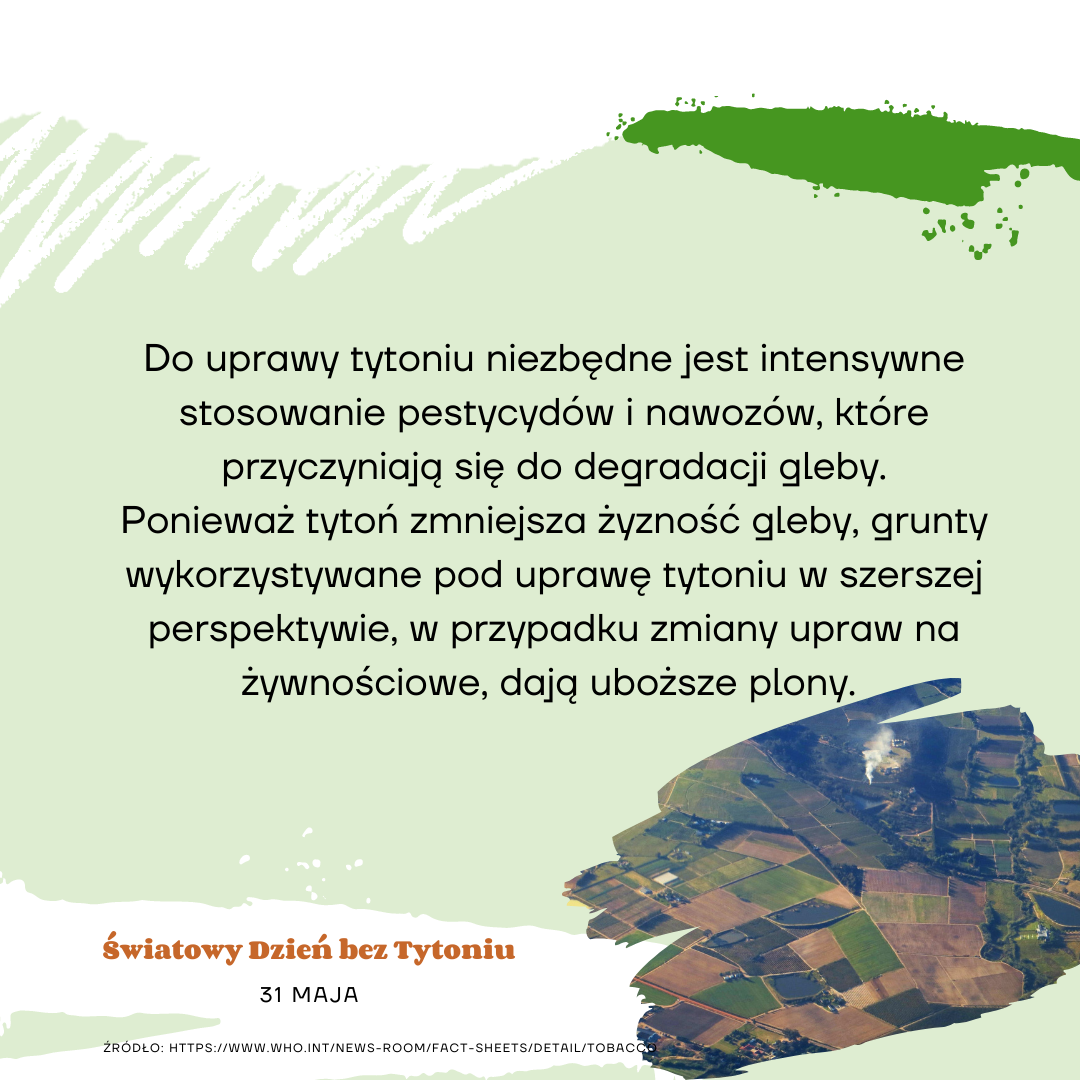 - Do uprawy tytoniu niezbędne jest intensywne stosowanie pestycydów i nawozów, które przyczyniają się do degradacji gleby.