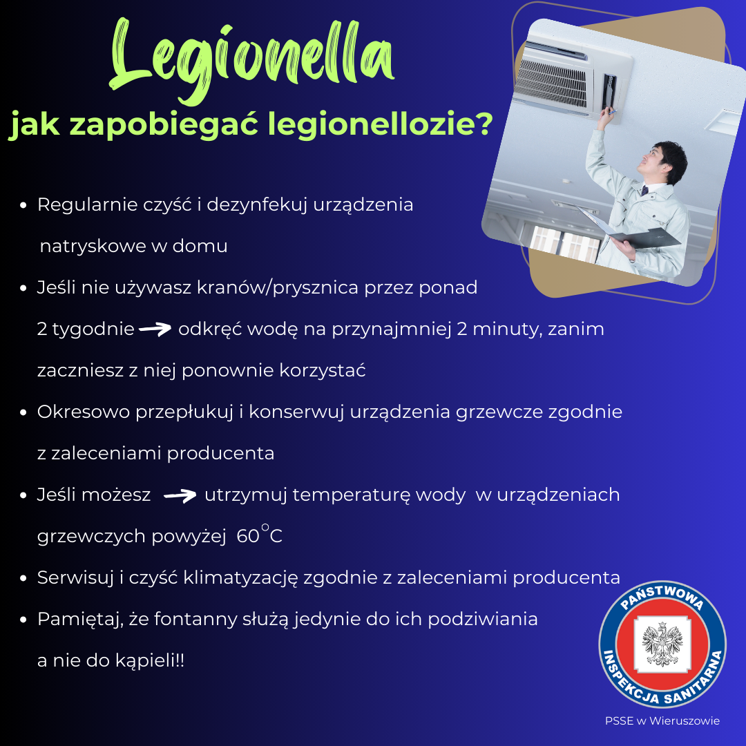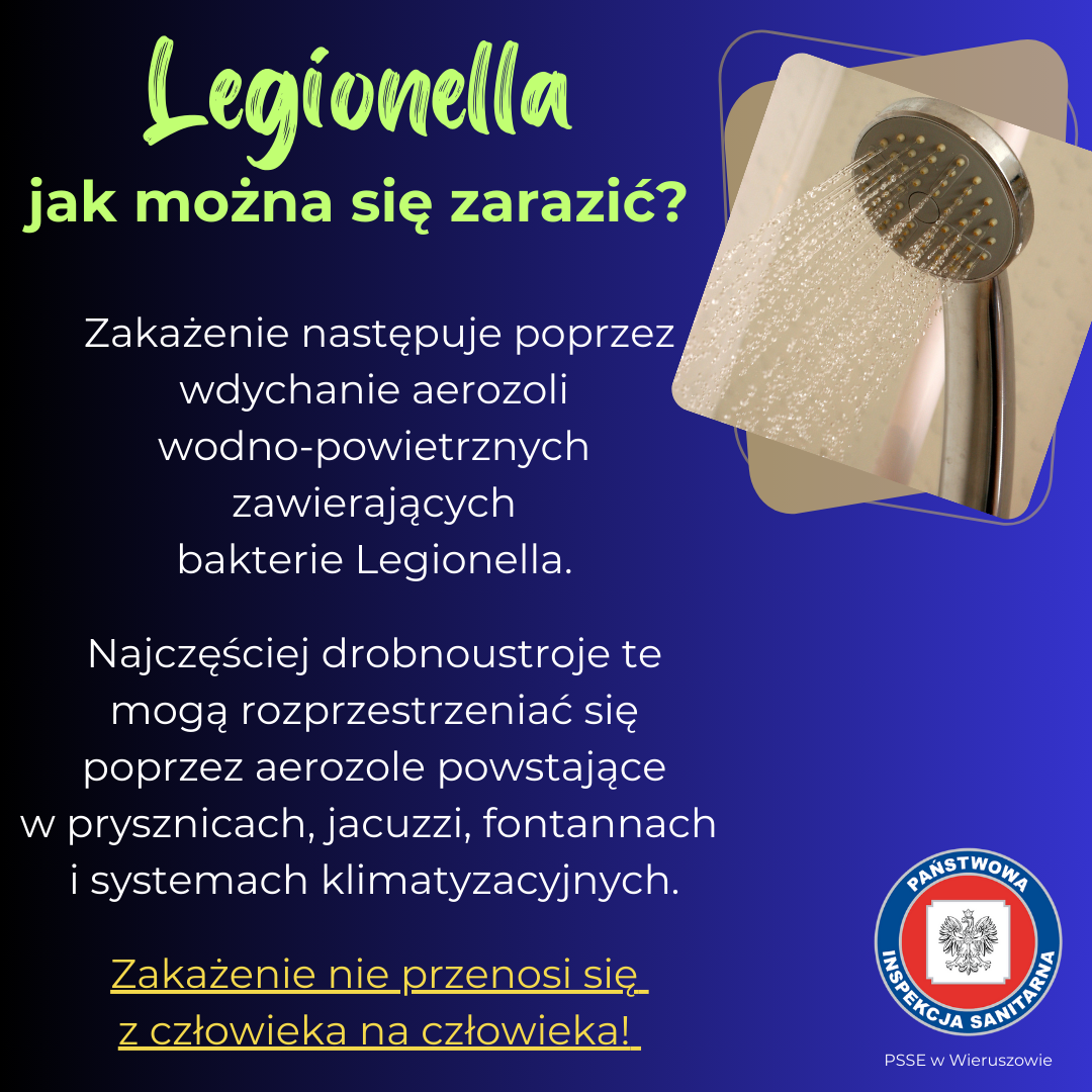 - Zakaźny jest aerozol wytwarzany przez urządzenia sanitarne, rekreacyjne, fontanny, nawilżacze, klimatyzacje, wieże chłodnicze itp., które są niewłaściwie serwisowane, niedokładnie czyszczone lub włączone do użytkowania po wydłużonym przestoju lub ograniczonej eksploatacji bez wdrożenia odpowiednich działań zapobiegających namnażaniu bakterii z rodzaju Legionella.