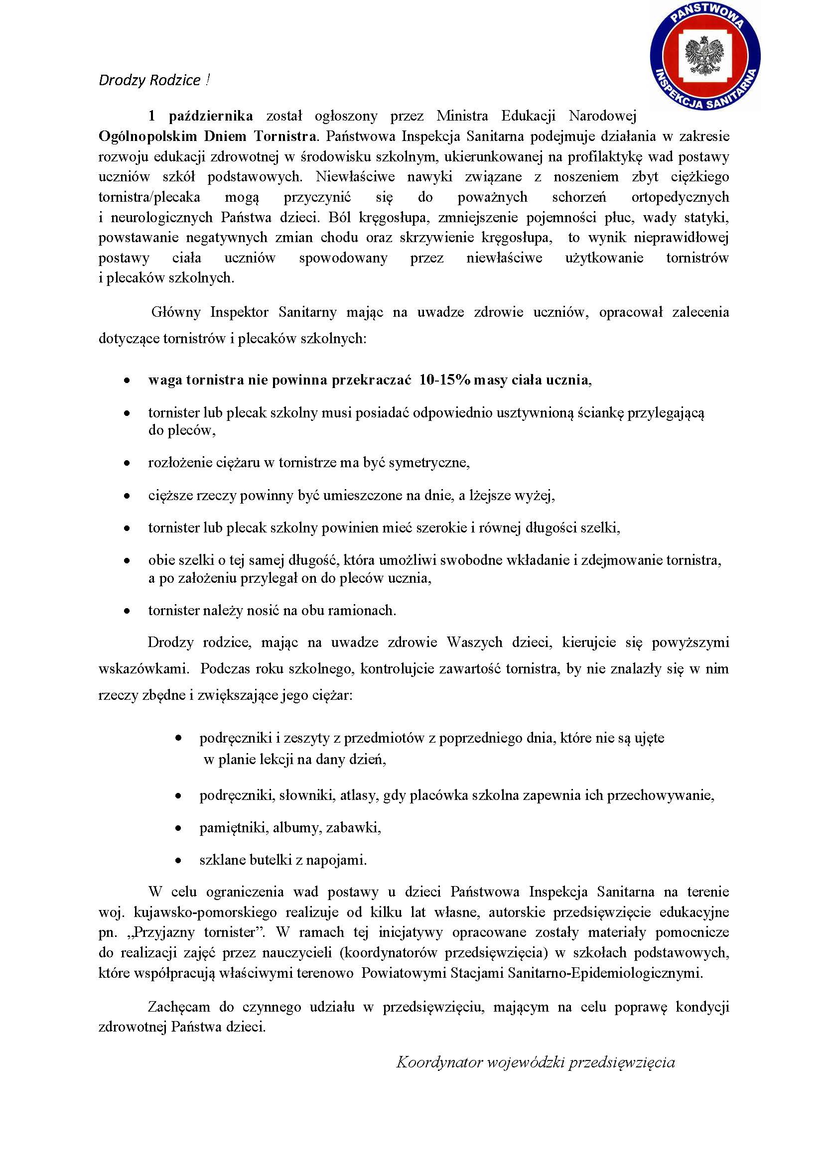 1 października został ogłoszony przez Ministra Edukacji Narodowej Ogólnopolskim Dniem Tornistra. Państwowa Inspekcja Sanitarna podejmuje działania w zakresie rozwoju edukacji zdrowotnej w środowisku szkolnym, ukierunkowanej na profilaktykę wad postawy uczniów szkół podstawowych. Niewłaściwe nawyki związane z noszeniem zbyt ciężkiego tornistra/plecaka mogą przyczynić się do poważnych schorzeń ortopedycznych