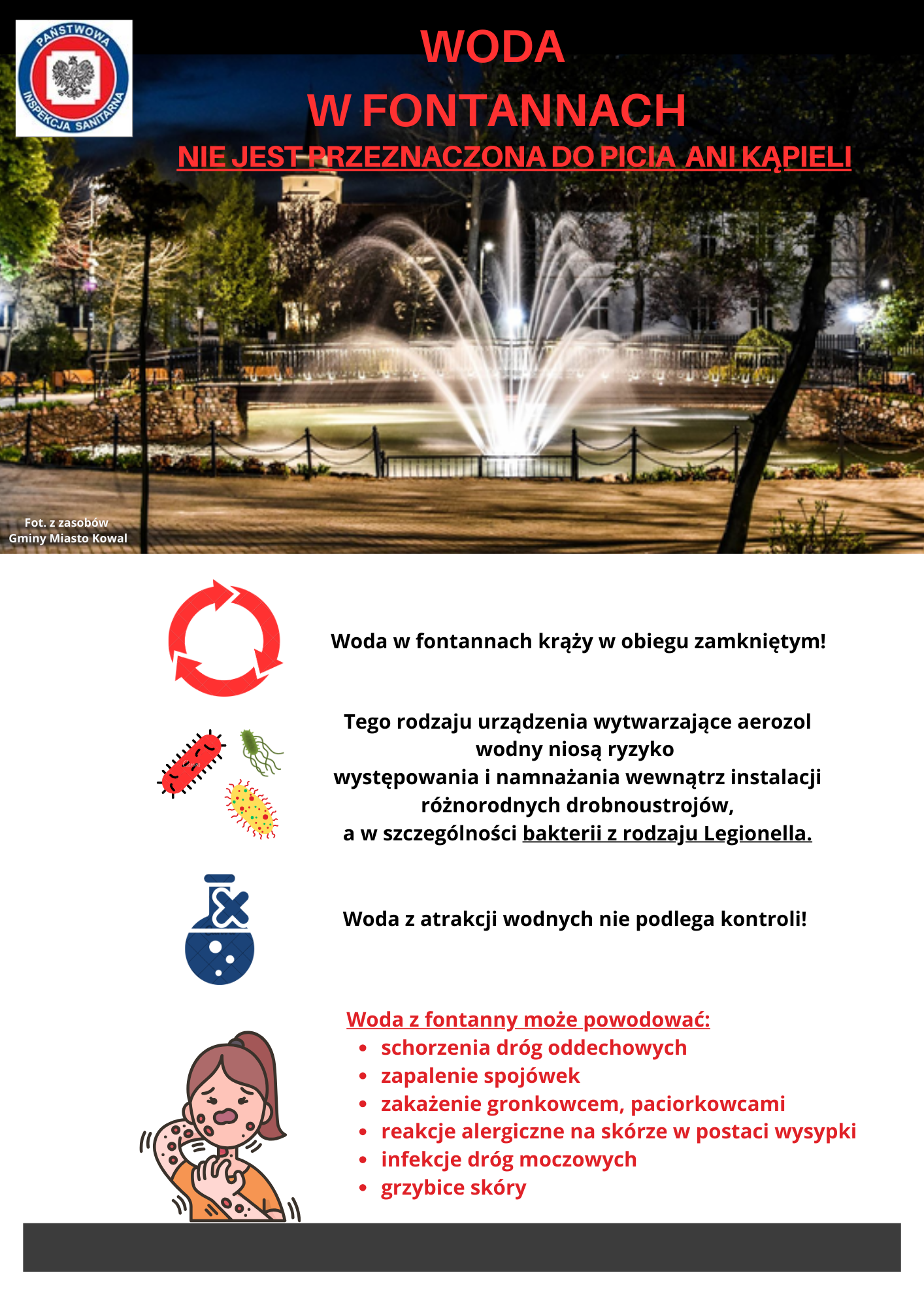 W związku z rozpoczynającym się sezonem letnim Państwowy Powiatowy Inspektor Sanitarny we Włocławku przypomina, iż woda w fontannach nie jest badana, nie nadaje się