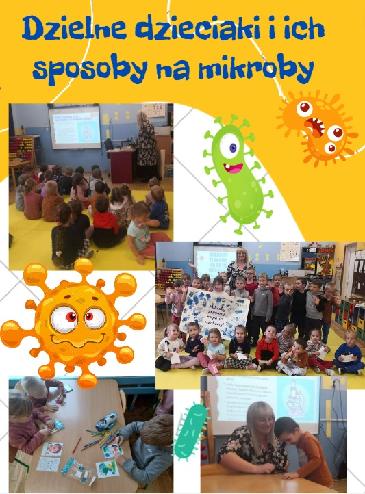 Przedszkolaki dowiedziały się co to są mikroby, jak się przed nimi ustrzec. Dzielne dzieciaki ćwiczyły prawidłowe mycie rączek, a także oglądały świat przez mikroskop. Dzieci stworzyły plakat „Mikroby żegnamy, pa pa im machamy ”. Na zakończenie zostały rozdane dzieciom kolorowanki.