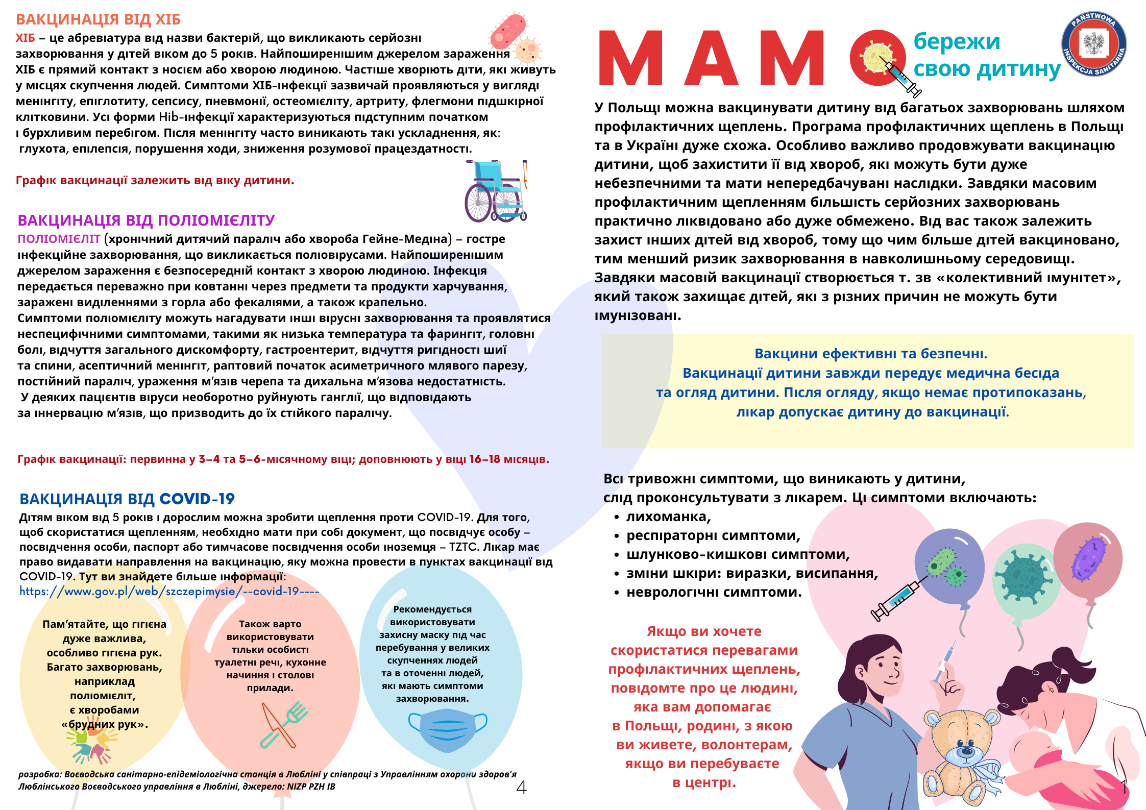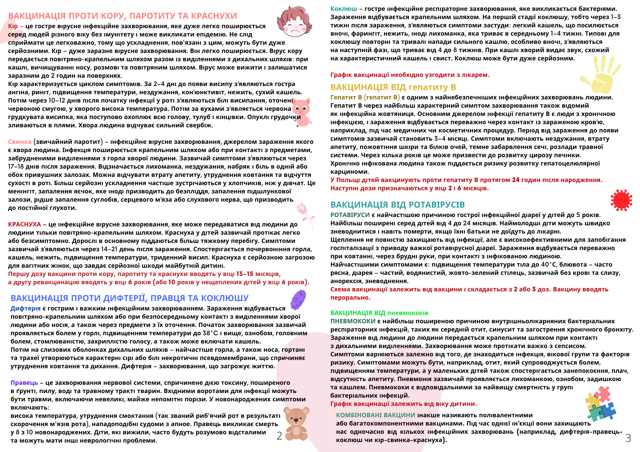W Polsce możesz uodpornić swoje dziecko na wiele chorób poprzez szczepienia ochronne. Program Szczepień Ochronnych w Polsce i w Ukrainie jest bardzo podobny. Szczególnie ważne jest aby kontynuować szczepienia dziecka, chroniąc je przed chorobami które mogą być bardzo niebezpieczne i nieprzewidywalne w skutkach.
