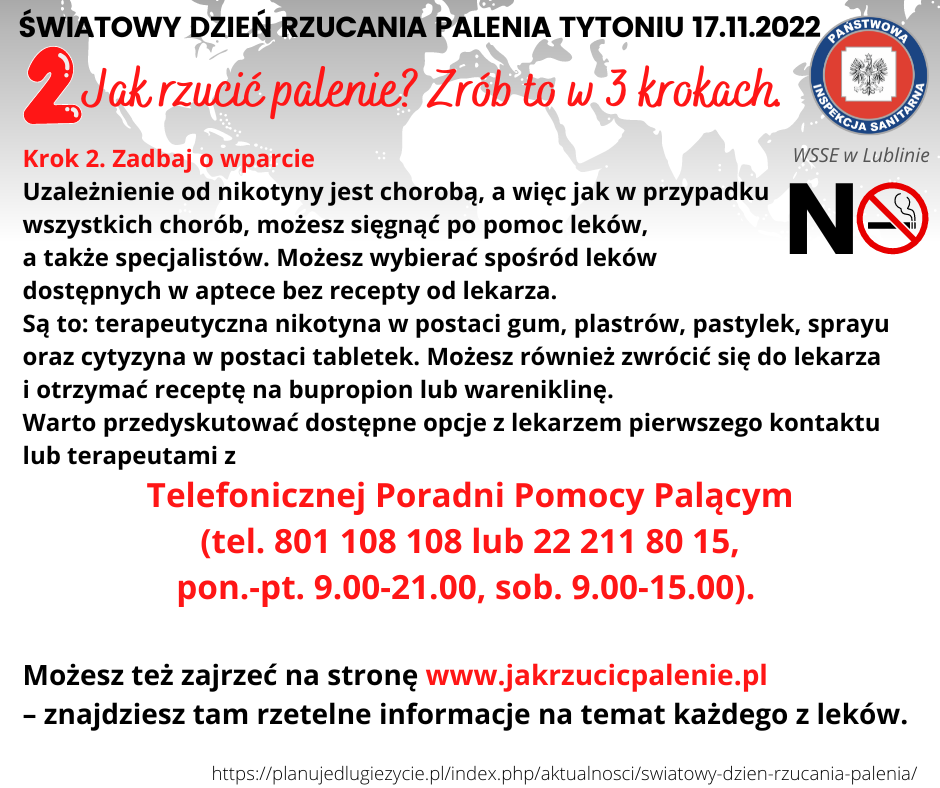 Uzależnienie od nikotyny jest chorobą, dlatego rzucanie palenia nie zawsze przebiega łatwo. Skorzystaj z profesjonalnej pomocy, by zwalczyć uzależnienie. Oferuje ją Ogólnopolska Telefoniczna Poradnia Pomocy Palącym działająca przy Narodowym Instytucie Onkologii w Warszawie pod telefonami 801 108 108 oraz 22 211 80 15. Konsultanci są dostępni od poniedziałku do piątku w godzinach 09:00 – 21:00 oraz w soboty w godzinach 9:00–15.00.