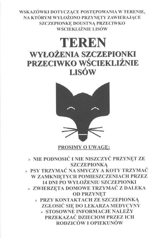 W dniach 4 - 15 listopada 2023 roku na terenie województwa mazowieckiego przeprowadzona zostanie akcja szczepienia doustnego lisów wolno żyjących przeciwko wściekliźnie. Szczepionka, będzie wykładana ręcznie oraz zrzucana z samolotów na lasy, pola i łąki. Przynęty ze szczepionką nie wolno dotykać!!!