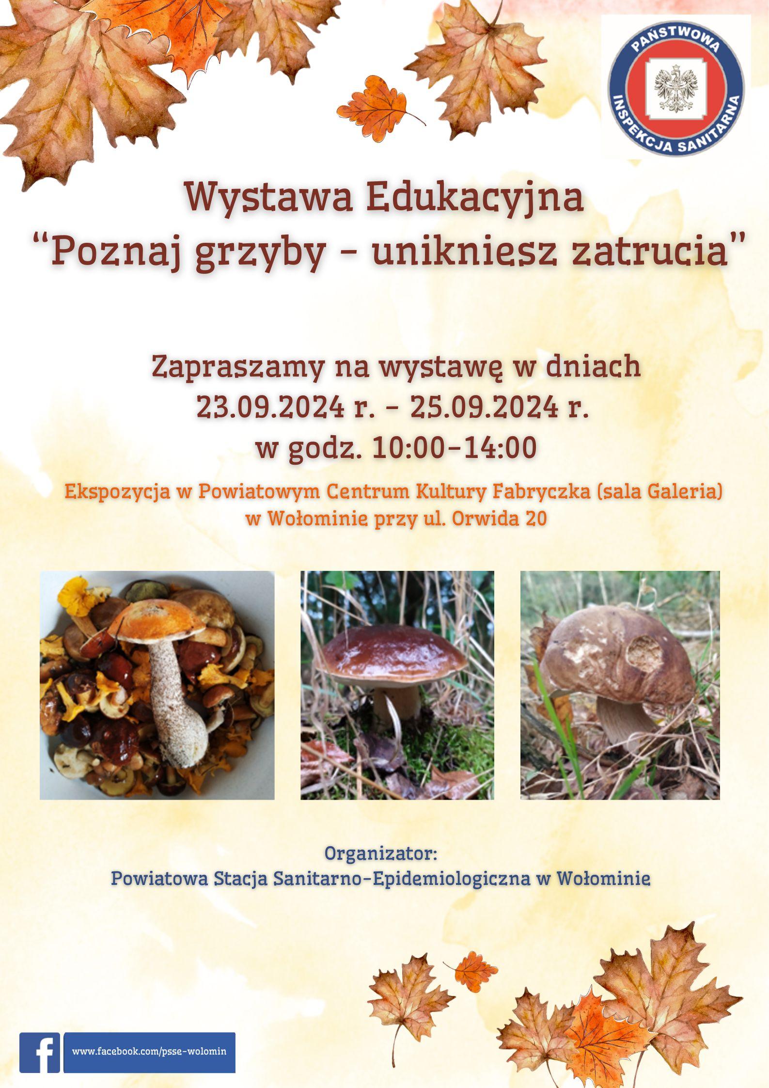 Państwowy Powiatowy Inspektor Sanitarny w Wołominie zaprasza na Wystawę Grzybów 🍄🌳 pt. „Poznaj Grzyby – Unikniesz Zatrucia”, organizowaną w dniach 23.09.2024 - 25.09.2024 r. w godz. 10:00 - 14:00 w Centrum Kultury Fabryczka w Wołominie, ul. Orwida 20.