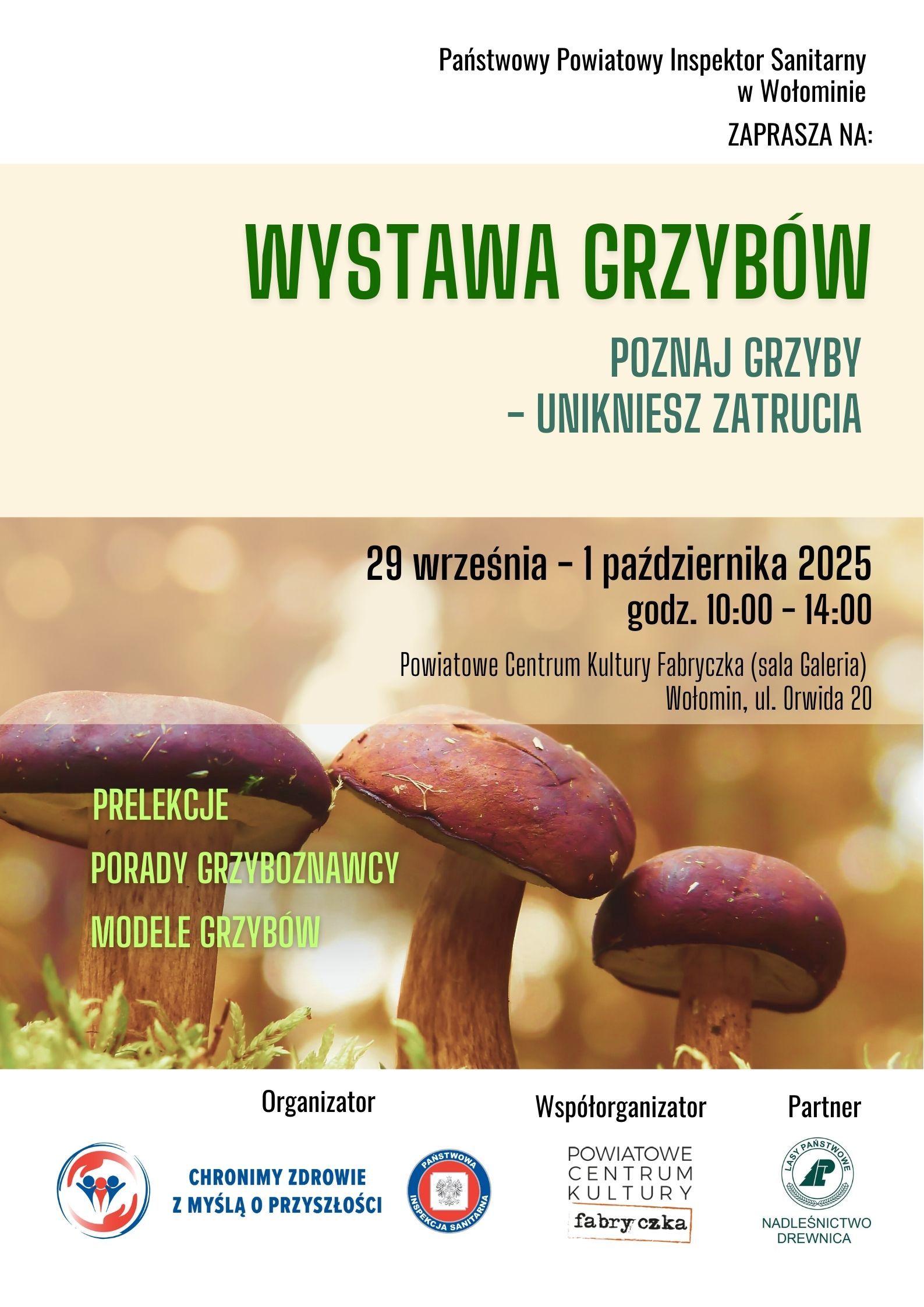 Państwowy Powiatowy Inspektor Sanitarny w Wołominie zaprasza na Wystawę Grzybów 🍄🌳 pt. „Poznaj Grzyby – Unikniesz Zatrucia”, organizowaną w dniach 29.09.2025 - 01.10.2025 r. w godz. 10:00 - 14:00 w Centrum Kultury Fabryczka w Wołominie, ul. Orwida 20.