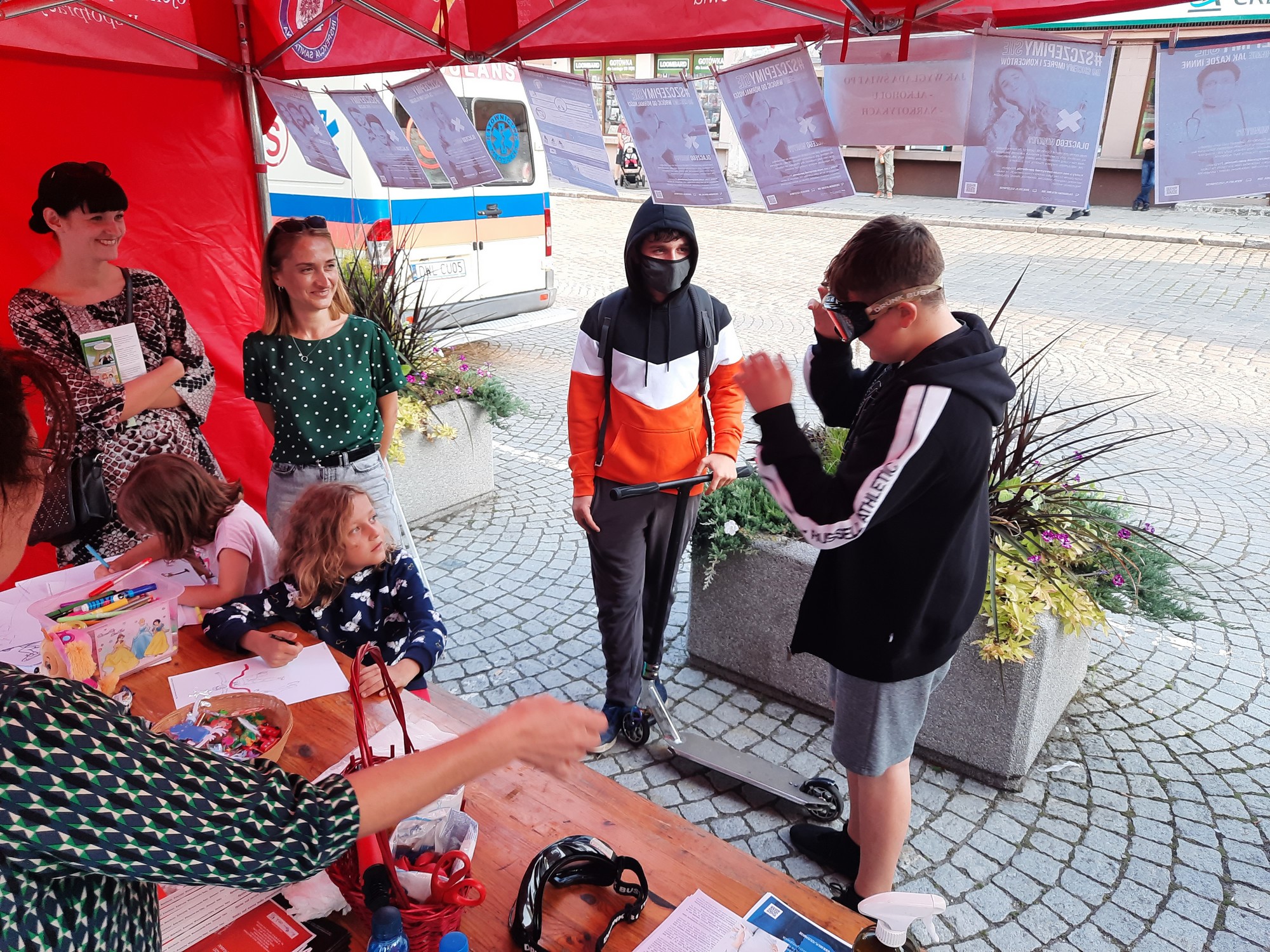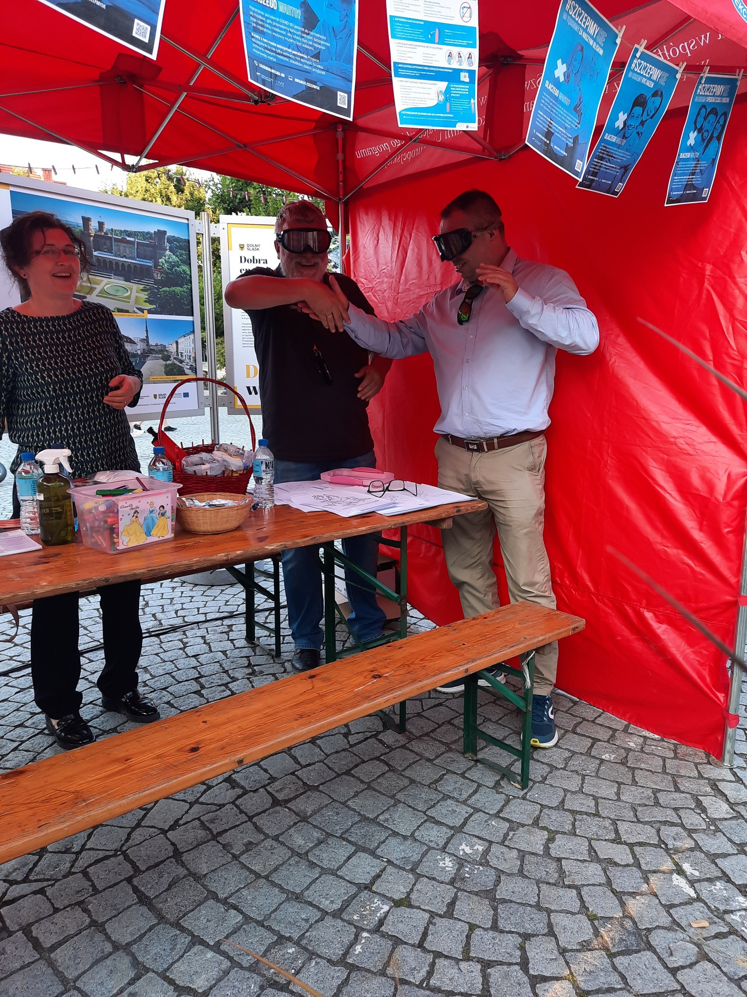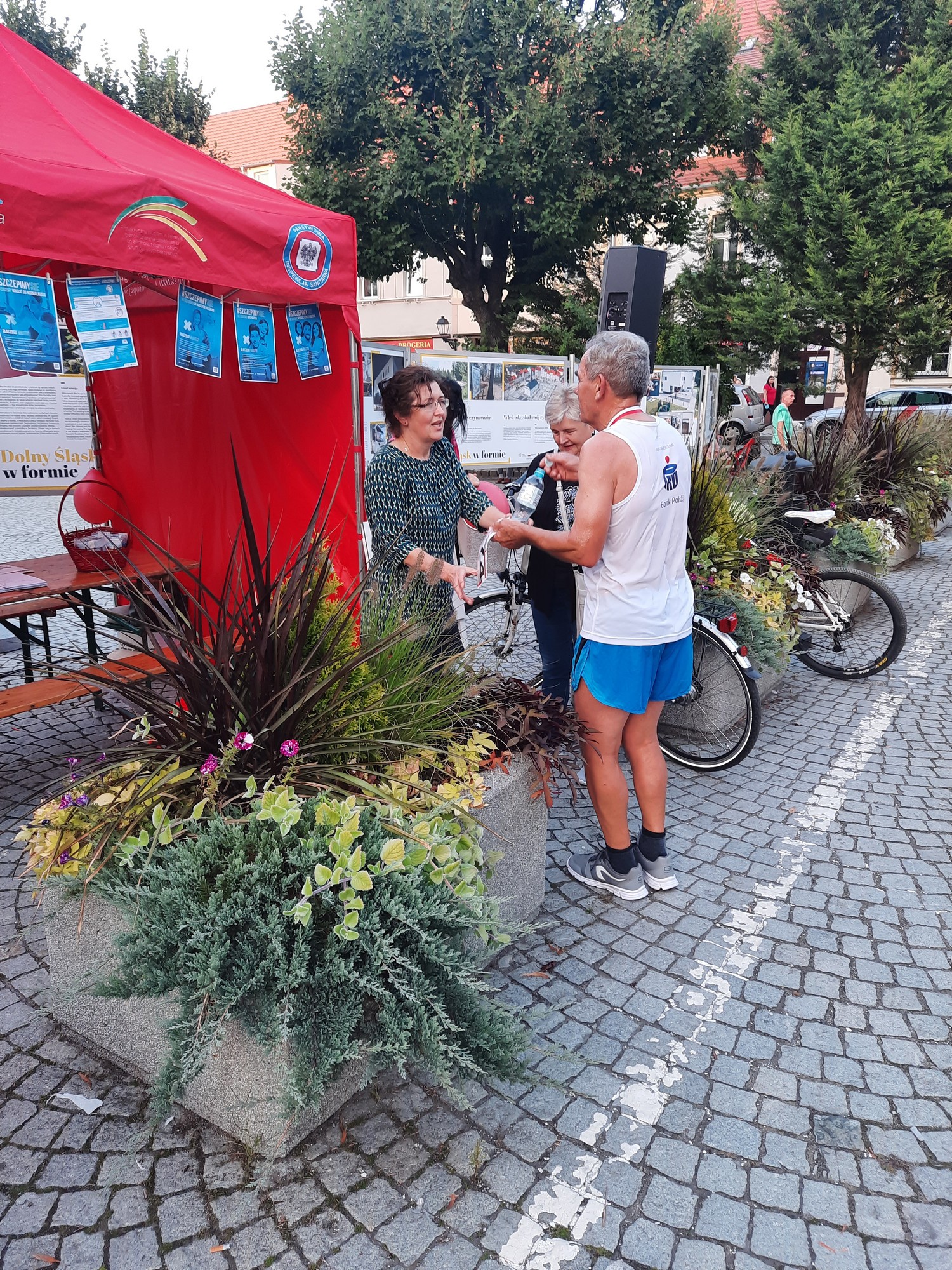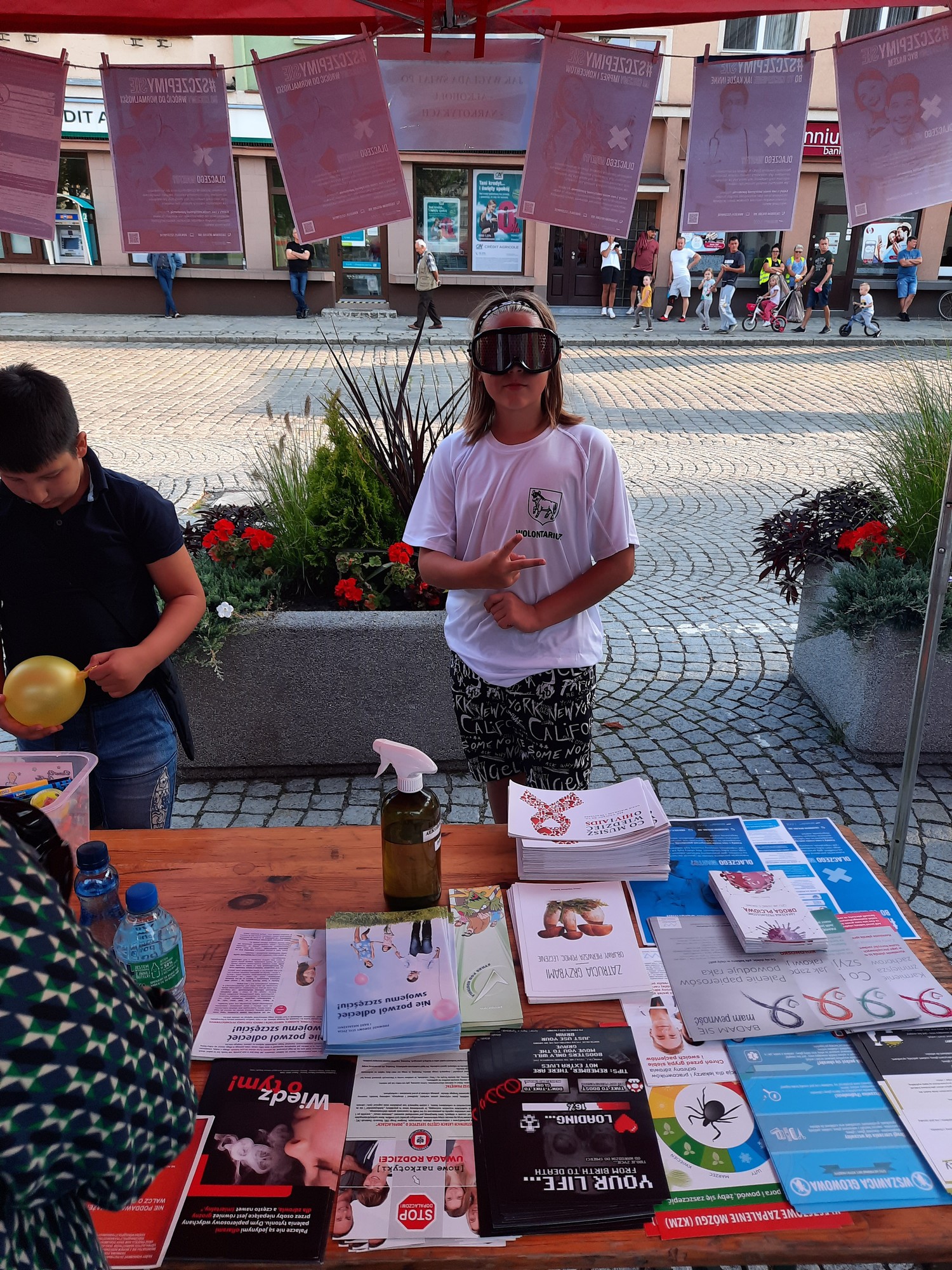 W dniu 4 września bieżącego roku na wołowskim rynku, przeprowadzony został już po raz siódmy- Bieg Flagi. Wśród przepięknej, zabytkowej scenerii Naszego Rynku oraz przy pięknej pogodzie, Powiatowa Stacja Sanitarno-Epidemiologiczna w Wołowie zorganizowała punkt Informacyjno – Edukacyjny. W ramach działań punktu, pracownicy naszej Inspekcji Sanitarnej zorganizowali konkurs plastyczny dla najmłodszych o tematyce prozdrowotnej, którego każdy z uczestników został nagrodzony upominkami. Dla starszych gości stoiska, przekazano szereg informacji na temat zachowań zagrażających Naszemu zdrowiu. między innymi tzw. dopalaczy, negatywnych skutków palenia tytoniu czy spożywania alkoholu. W sposób szczególny największą uwagę zwrócono na konieczność wykonywania szczepień przeciw COVID-19, w ramach kampanii społecznej „Szczepimy Się”. Pracownicy obsługujący punkt informacyjny w sposób bardzo skrupulatny, poparty wiedzą merytoryczną, przedstawili korzyści dla Naszego zdrowia, wynikające z zaszczepienia. W czasie funkcjonowania punktu udzielono również fachowych porad na temat zdrowego odżywiania, ze szczególnym zwróceniem uwagi na trwający sezon grzybobrania, a także uczulano mieszkańców na zagrożenia chorobami odkleszczowymi. Stoisko Inspekcji Sanitarnej cieszyło się ogromnym zainteresowaniem. Nasi goście bardzo chętnie korzystali z przymierzenia tzw. alko i narkogogli, poznając tym samym niepożądane doznania towarzyszące stosowaniu tych uzależniających używek. Podczas blisko sześciogodzinnego funkcjonowania Naszego punktu rozdano kilkaset ulotek poruszających tematykę zdrowia Naszych mieszkańców.