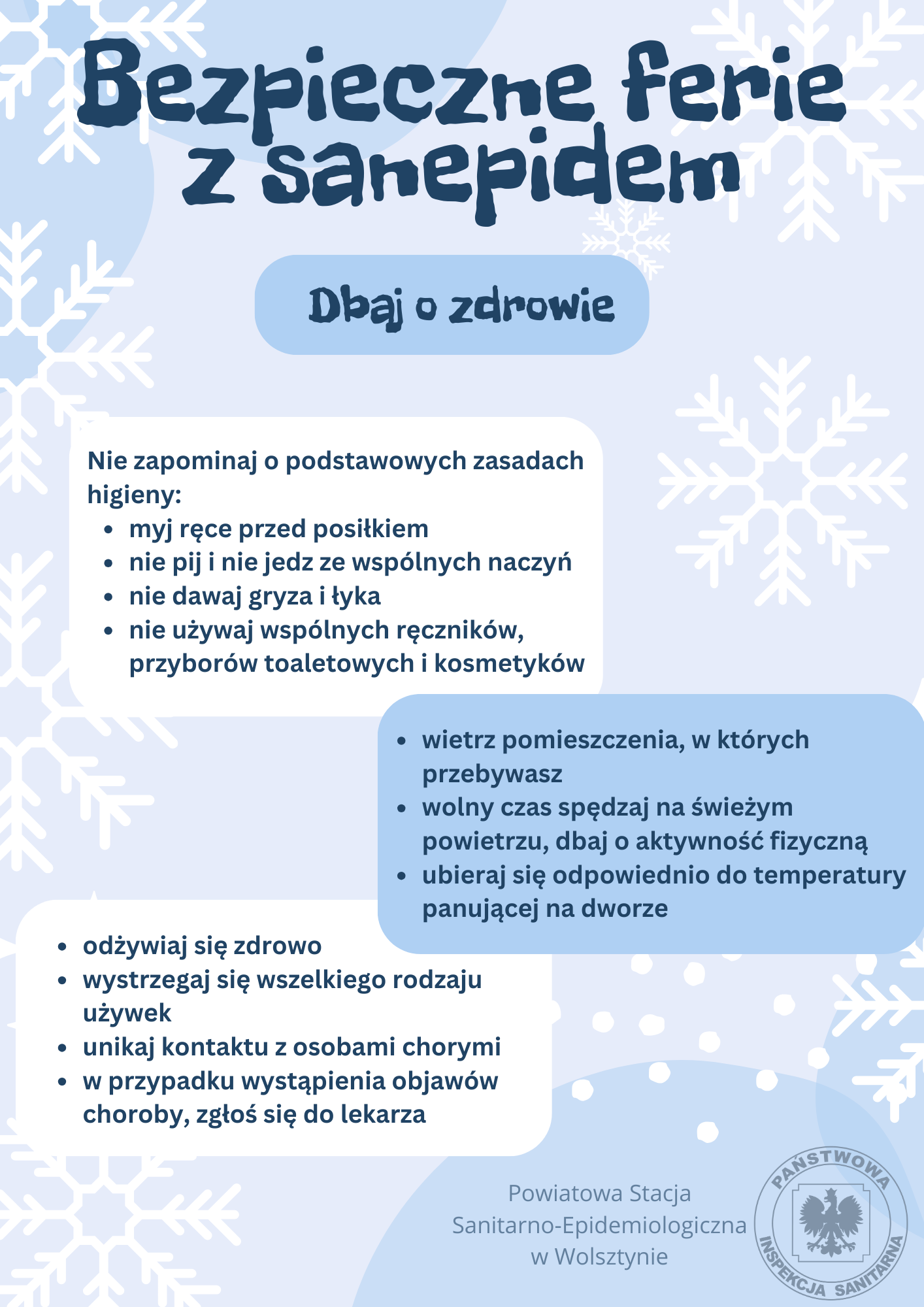 Pracownicy Powiatowej Stacji Sanitarno-Epidemiologicznej w Wolsztynie w trosce o bezpieczeństwo i zdrowie dzieci i młodzieży przygotowali plakat dot. bezpieczeństwa podczas ferii zimowych.