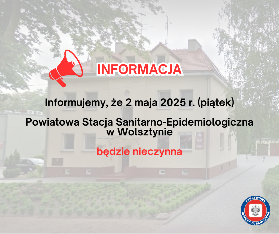 Informujemy, że 2 maja 2025 r. Powiatowa Stacja Sanitarno-Epidemiologiczna w Wolsztynie będzie nieczynna 16.04.2025 Zdjęcia (1) Pokaż zdjęcie 1 z galerii.
