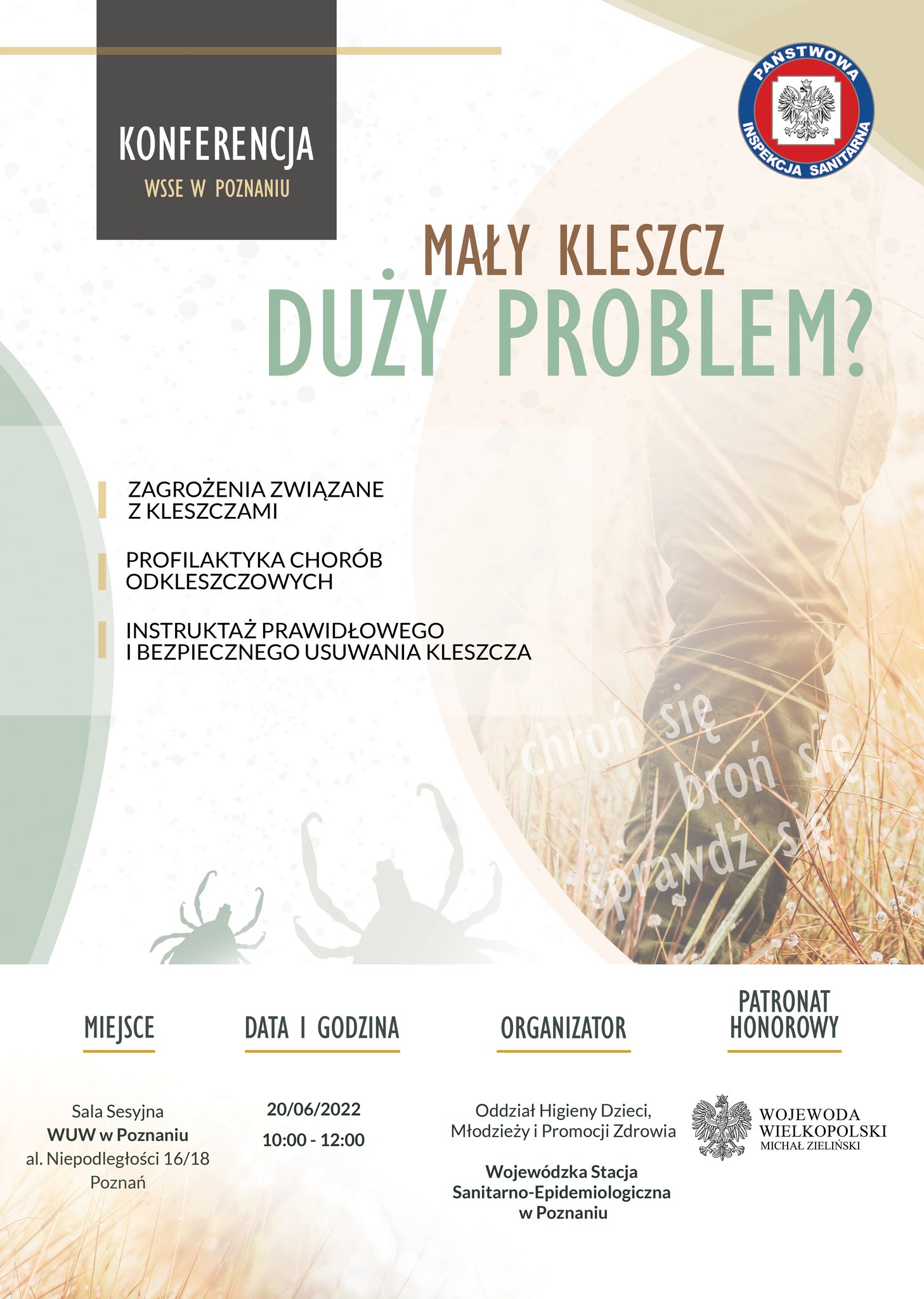 Zachęcamy organizatorów wypoczynku i wychowawców, pracowników nadleśnictw, pielęgniarki, higienistki szkolne i pielęgniarki podstawowej opieki zdrowotnej oraz ratowników medycznych do wzięcia udziału w konferencji „Mały kleszcz – duży problem?”, dotyczącej zagrożeń związanych z kleszczami oraz profilaktyki chorób odkleszczowych, połączonej z instruktażem poprawnego usuwania kleszcza, która odbędzie się 20 czerwca 2022 r. w Sali Sesyjnej Wielkopolskiego Urzędu Wojewódzkiego w Poznaniu. Formularz zgłoszenia, po wcześniejszym wypełnieniu, należy przesłać na adres: konferencje@wssepoznan.pl do 15 czerwca 2022 r.