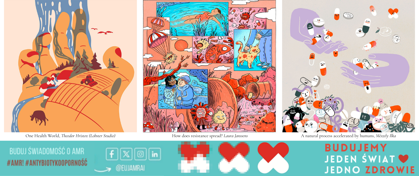 W ramach projektu EU-JAMRAI artyści z różnych krajów europejskich przygotowali 30 ilustracji, które w twórczy sposób obrazują problem oporności na środki przeciwdrobnoustrojowe. Zobacz te prace Obrazując lekooporność | EU-JAMRAI i zaangażuj się! Opowiedz innym, jak ważne jest zachowanie skuteczności antybiotyków.